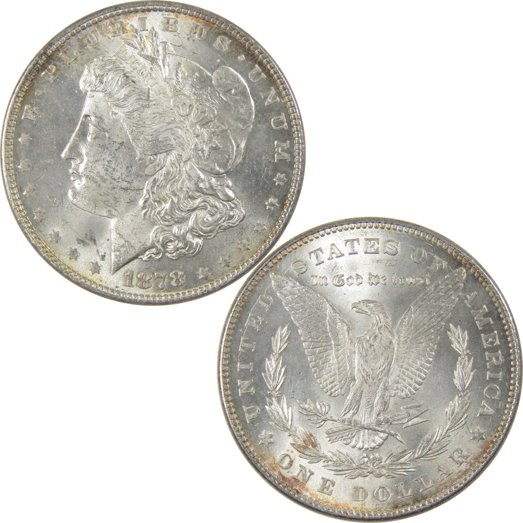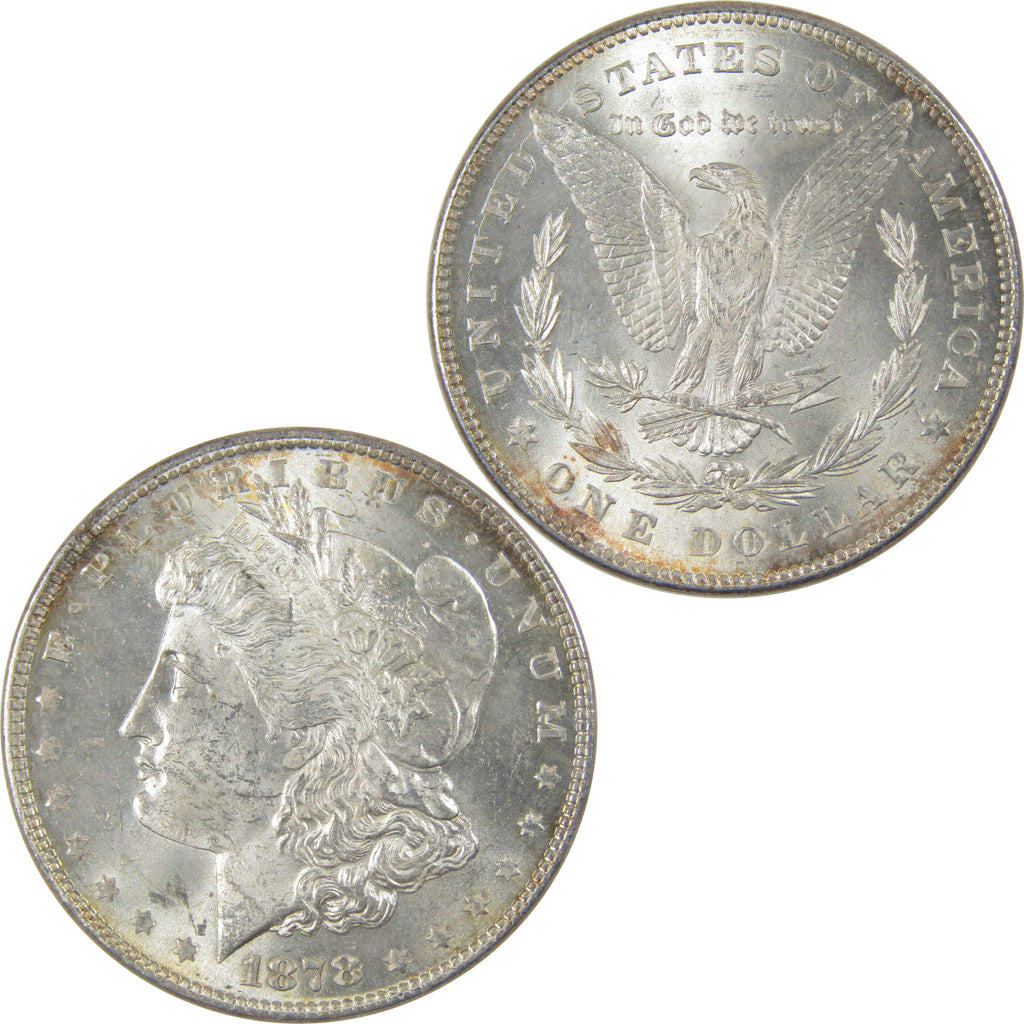 A genuine 1878 7/8TF Strong Morgan Silver Dollar Coin, in Uncirculated Mint State Condition. Contains 90% Silver