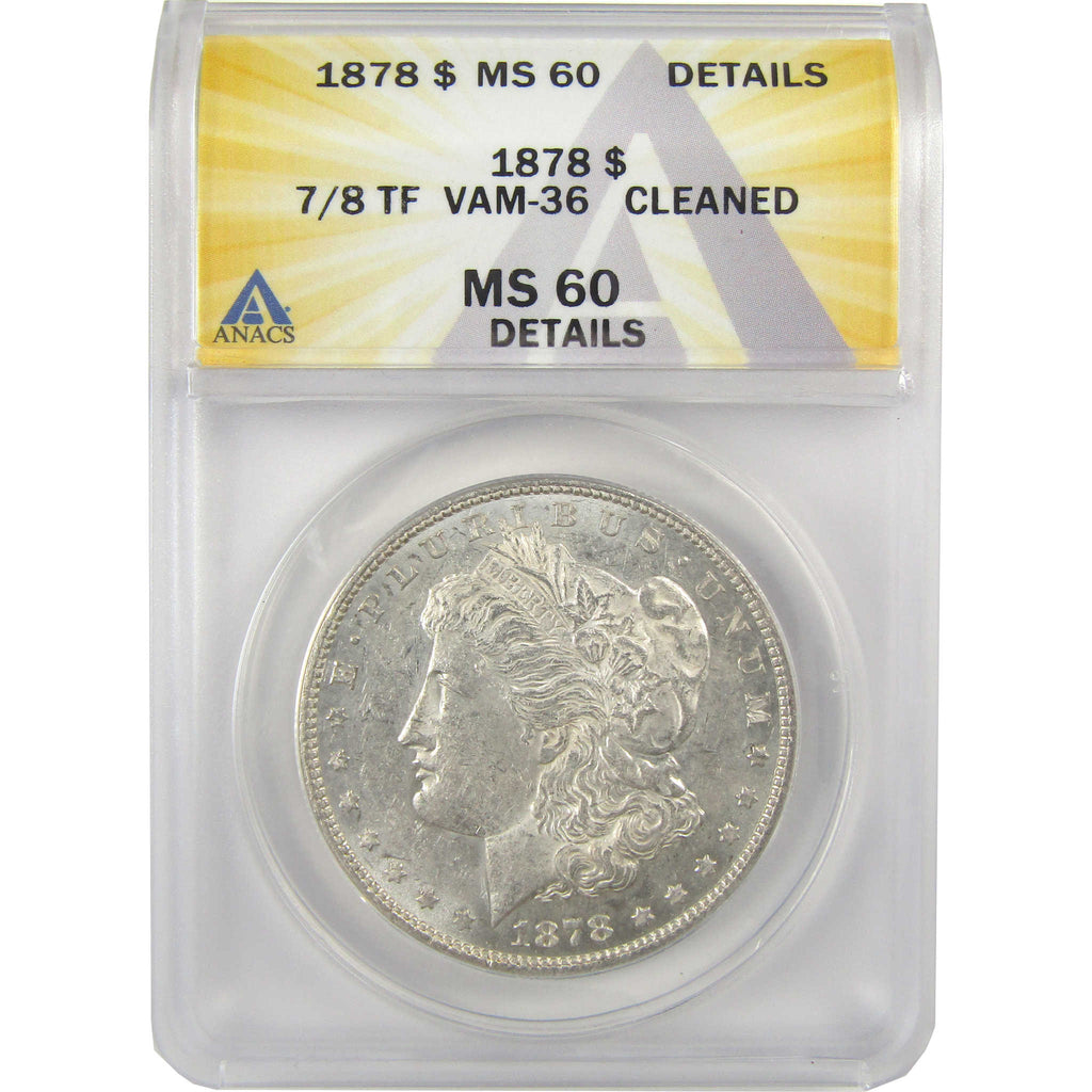 A genuine 1878 7/8TF, VAM-36 Morgan Silver Dollar Coin, graded and certified MS 60 Details by ANACS. Contains 90% Silver. Cleaned
