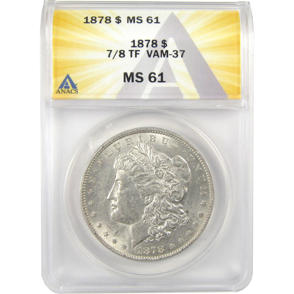 A genuine 1878 7/8TF, VAM-37 Morgan Silver Dollar Coin, graded and certified MS 61 by ANACS. Contains 90% Silver