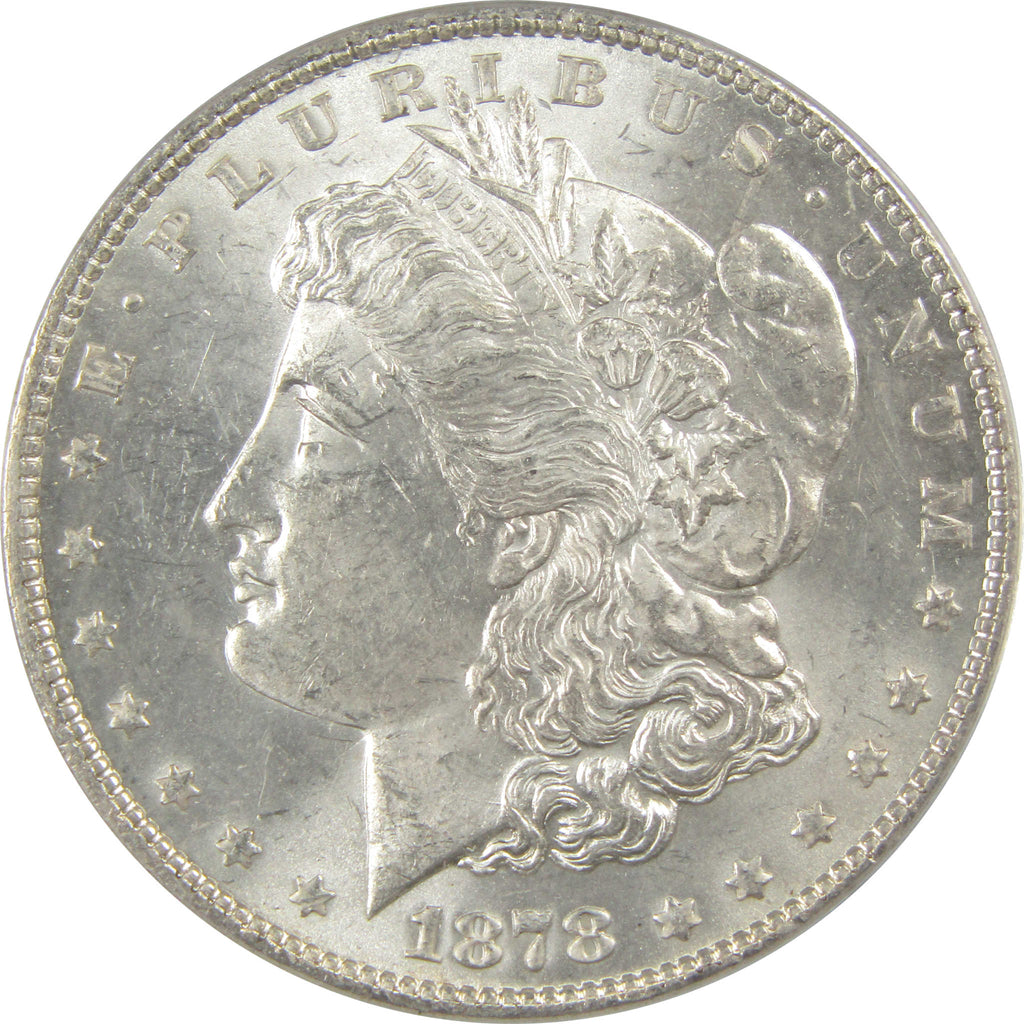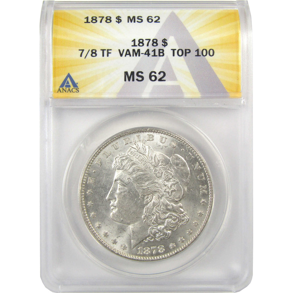 A genuine 1878 7/8TF, VAM-41B, Top 100 Morgan Silver Dollar Coin, graded and certified MS 62 by ANACS. Contains 90% Silver
