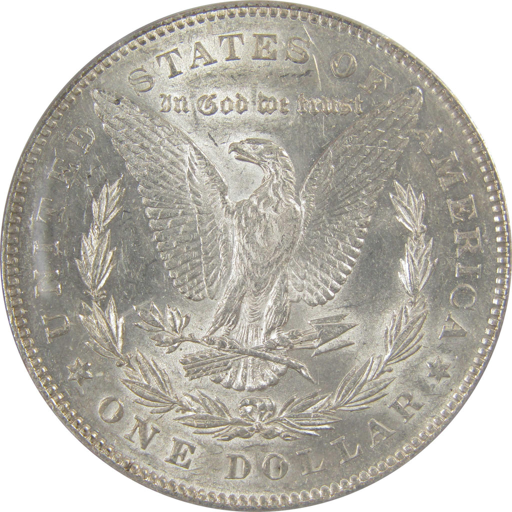 This large 90% silver Morgan dollar bears George T. Morgan's classic depiction of Liberty facing left in a Phrygian cap and a spray of leaves held by a ribbon inscribed LIBERTY. The reverse features an eagle clutching a branch and three arrows.