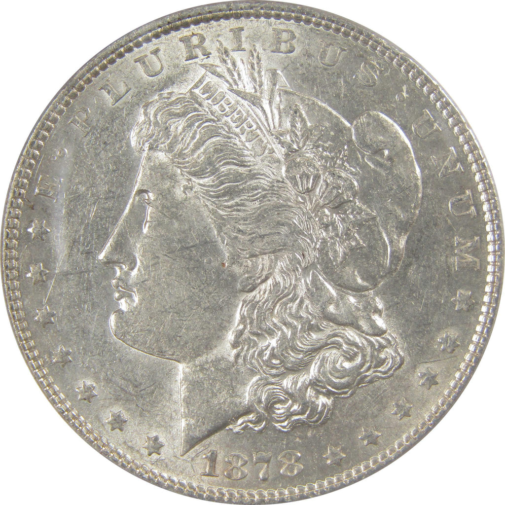 A genuine 1878 7TF, Rev 78 Morgan Silver Dollar Coin, graded and certified AU 50 by ANACS. Contains 90% Silver