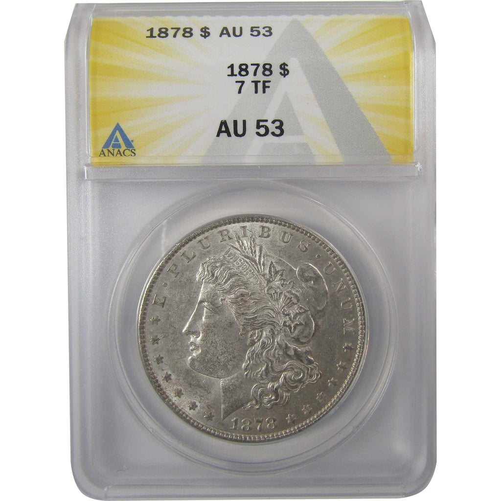 A genuine 1878 7TF, Rev 78 Morgan Silver Dollar Coin, graded and certified AU 53 by ANACS. Contains 90% Silver