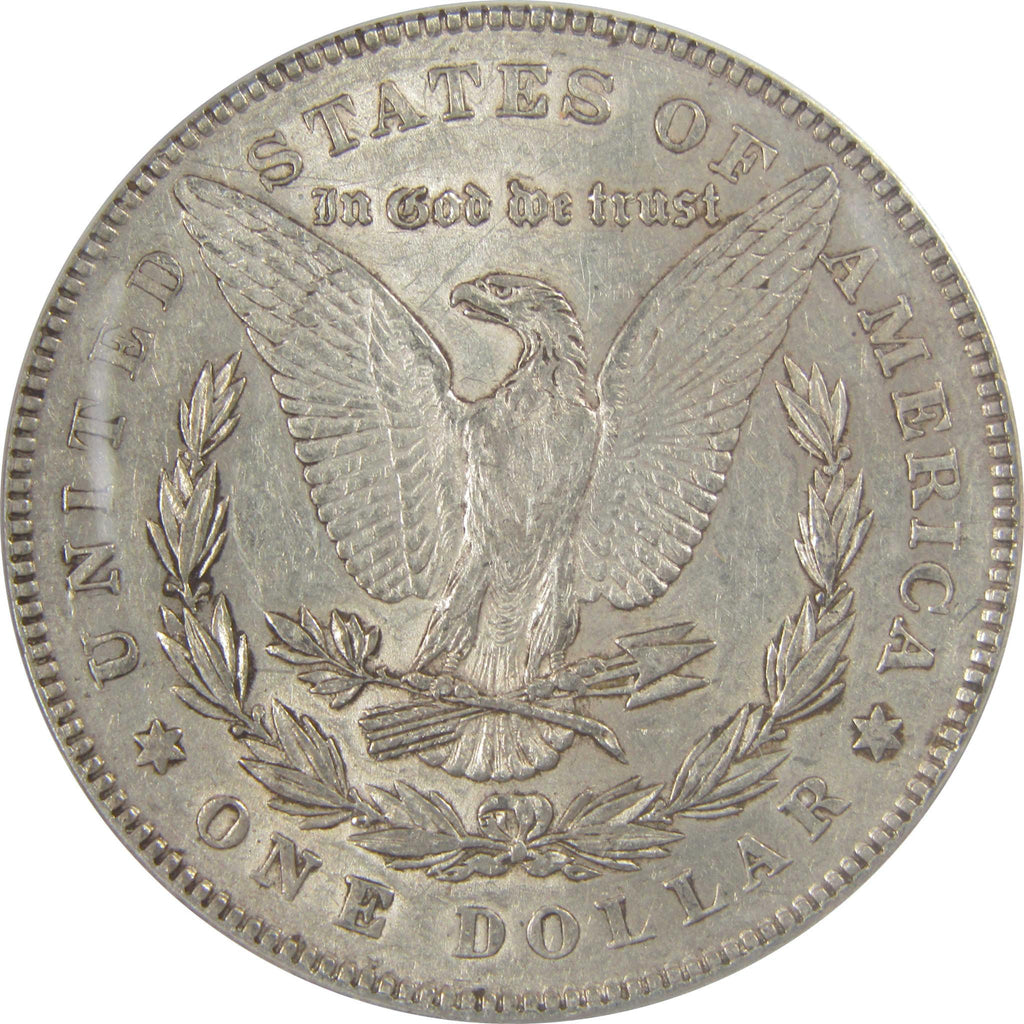 This large 90% silver Morgan dollar bears George T. Morgan's classic depiction of Liberty facing left in a Phrygian cap and a spray of leaves held by a ribbon inscribed LIBERTY. The reverse features an eagle clutching a branch and three arrows.