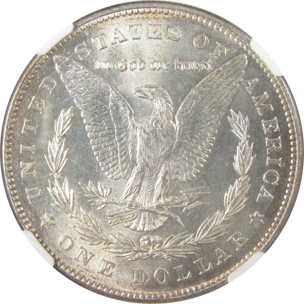 This large 90% silver Morgan dollar bears George T. Morgan's classic depiction of Liberty facing left in a Phrygian cap and a spray of leaves held by a ribbon inscribed LIBERTY. The reverse features an eagle clutching a branch and three arrows.