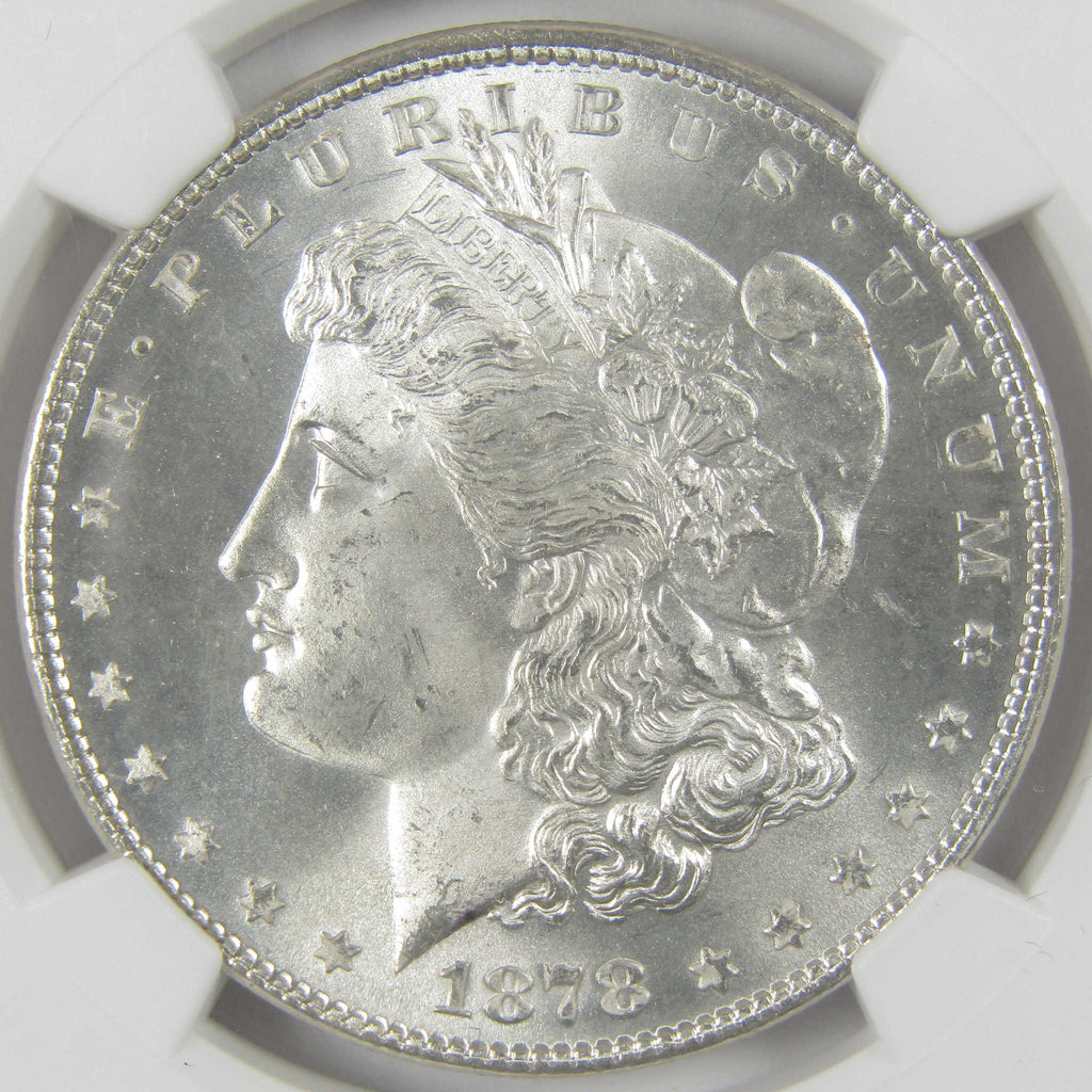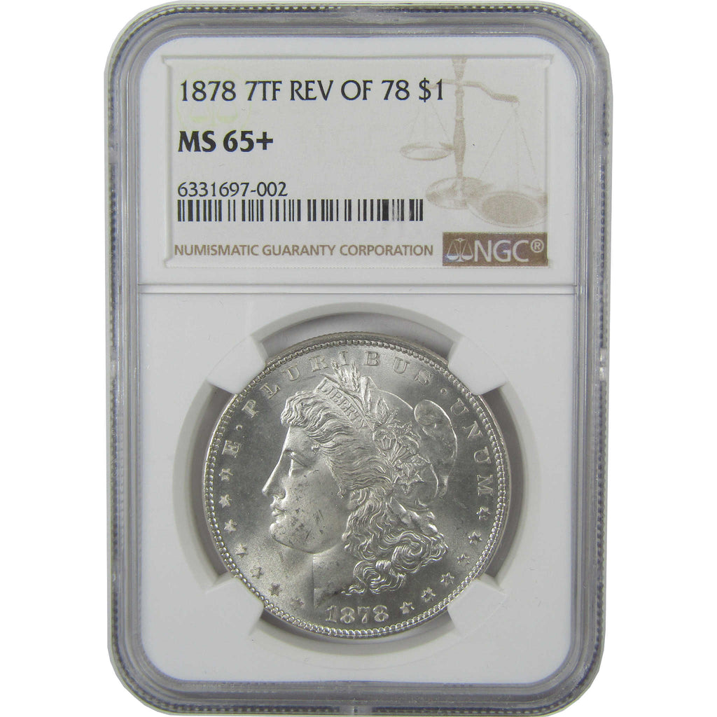 A genuine 1878 7TF, Rev 78 Morgan Silver Dollar Coin, graded and certified MS 65+ by NGC. Contains 90% Silver