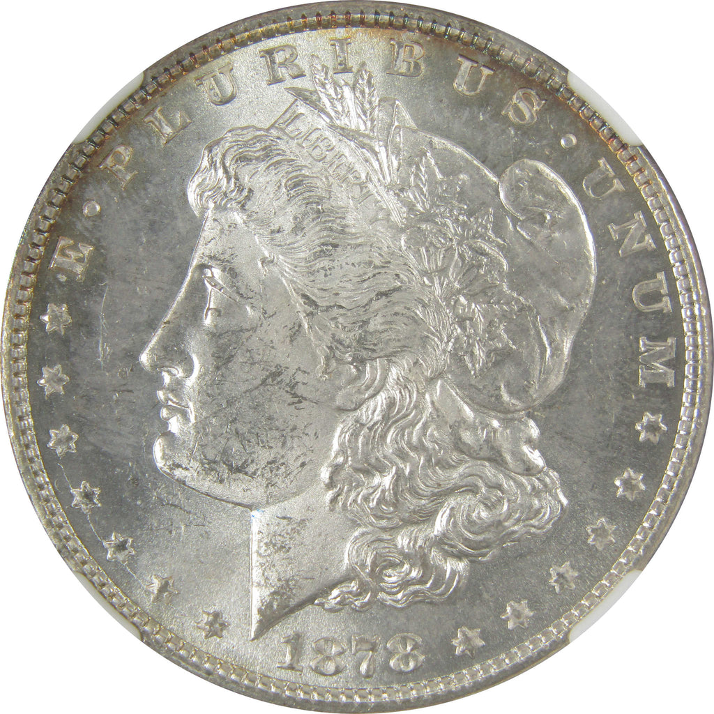 A genuine 1878 8TF Morgan Silver Dollar Coin, graded and certified MS 63 by NGC. Contains 90% Silver