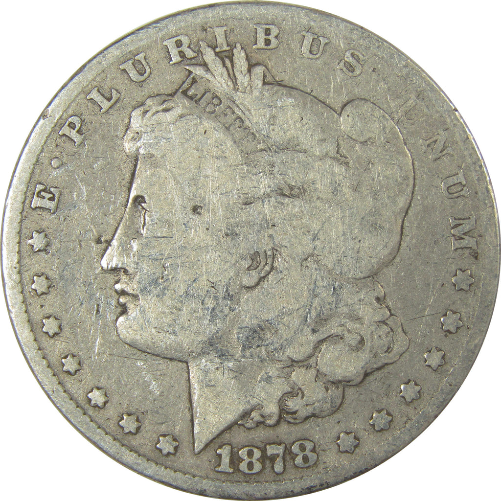 A genuine 1878 8TF Morgan Silver Dollar Coin, in VG Very Good Details Condition. Contains 90% Silver. Cleaned