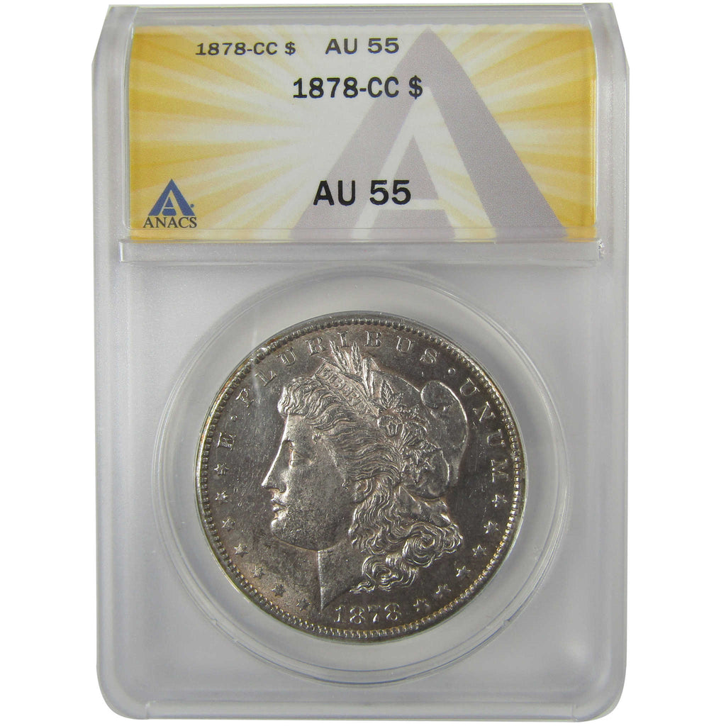 A genuine 1878 CC Morgan Silver Dollar Coin, graded and certified AU 55 by ANACS. Contains 90% Silver