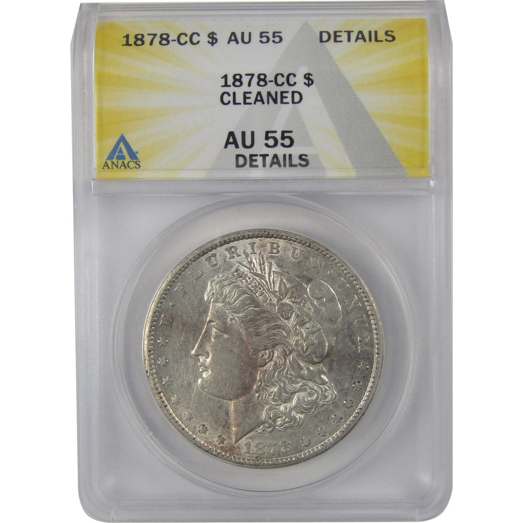 A genuine 1878 CC Morgan Silver Dollar Coin, graded and certified AU 55 Details by ANACS. Contains 90% Silver. Cleaned