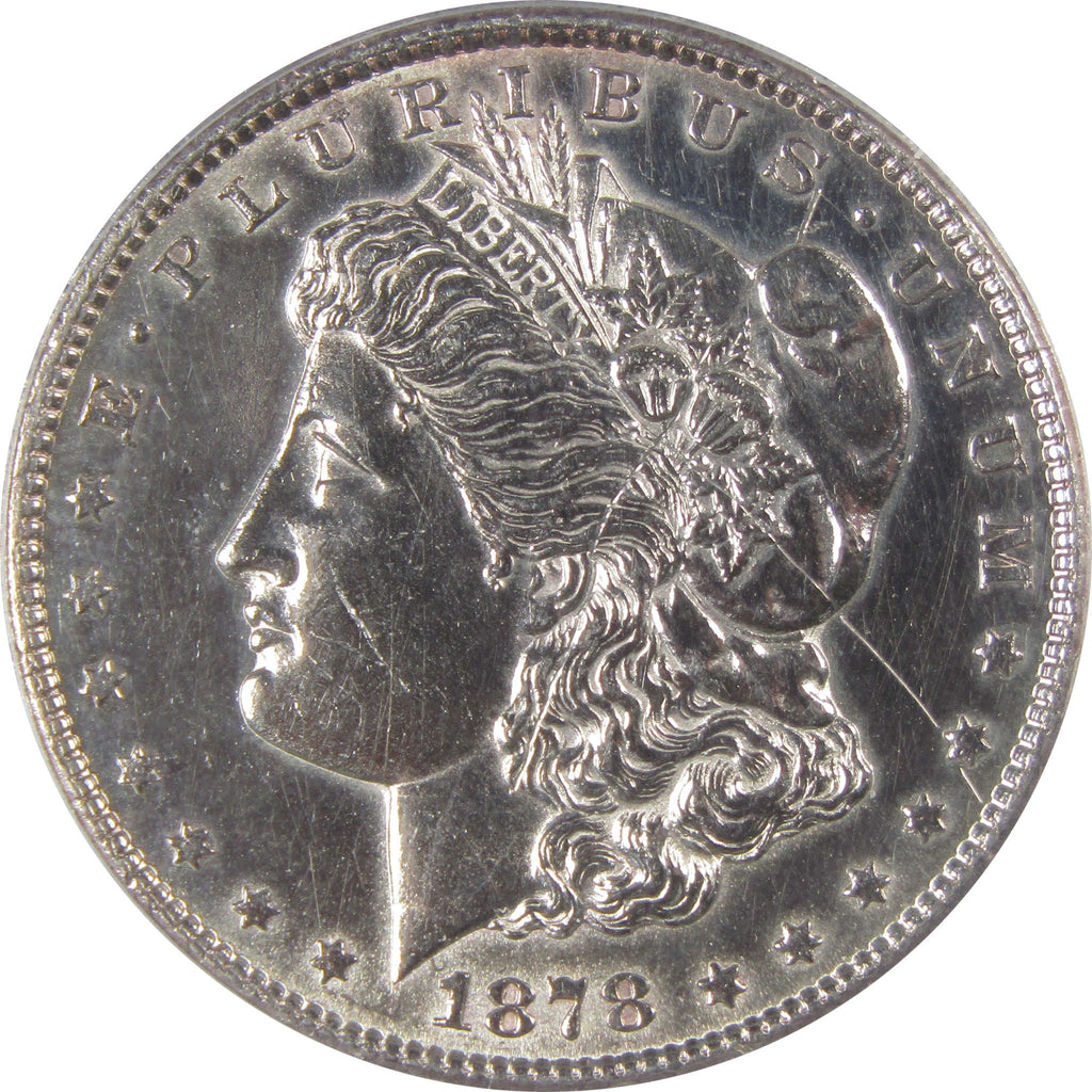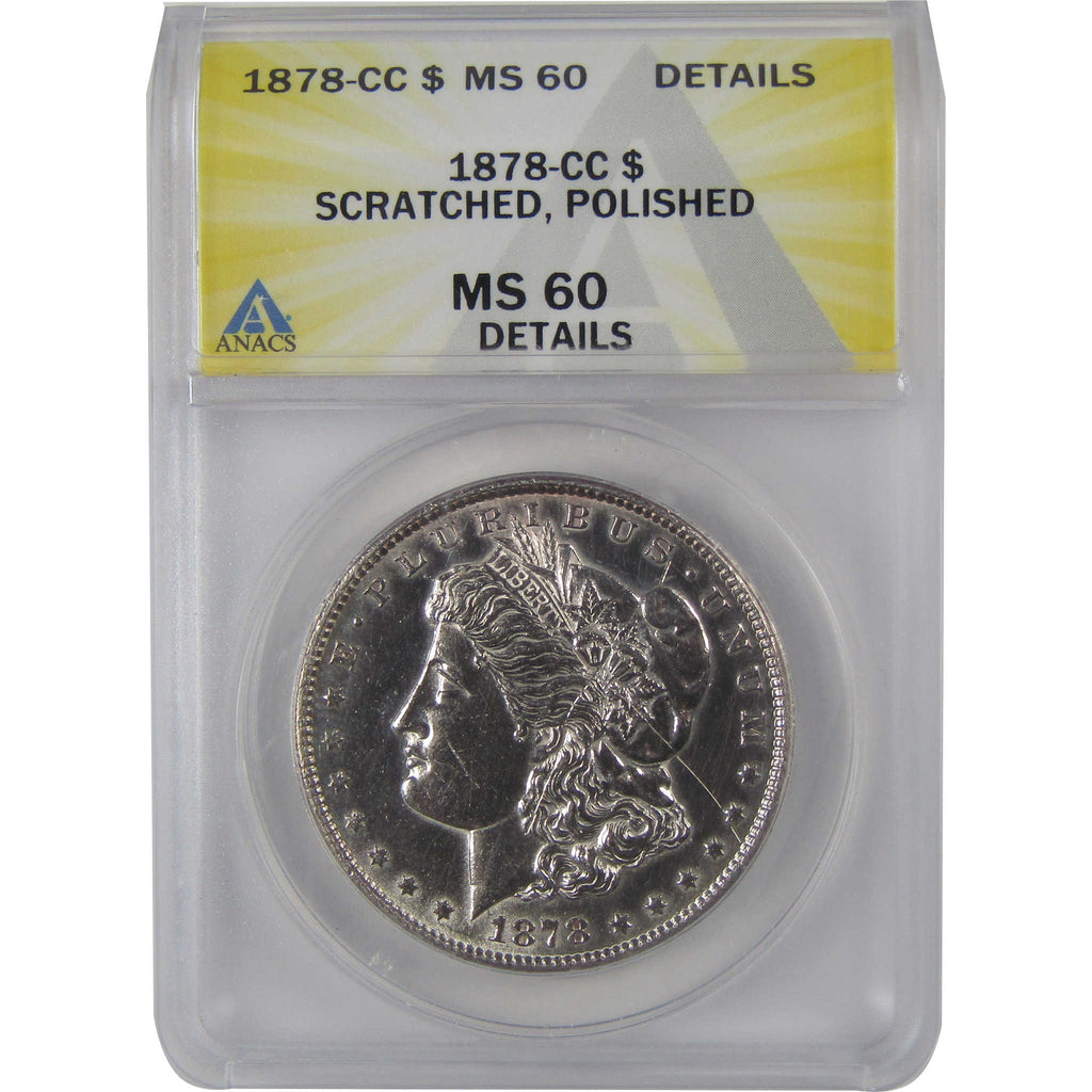 A genuine 1878 CC Morgan Silver Dollar Coin, graded and certified MS 60 Details by ANACS. Contains 90% Silver. Scratched, Polished