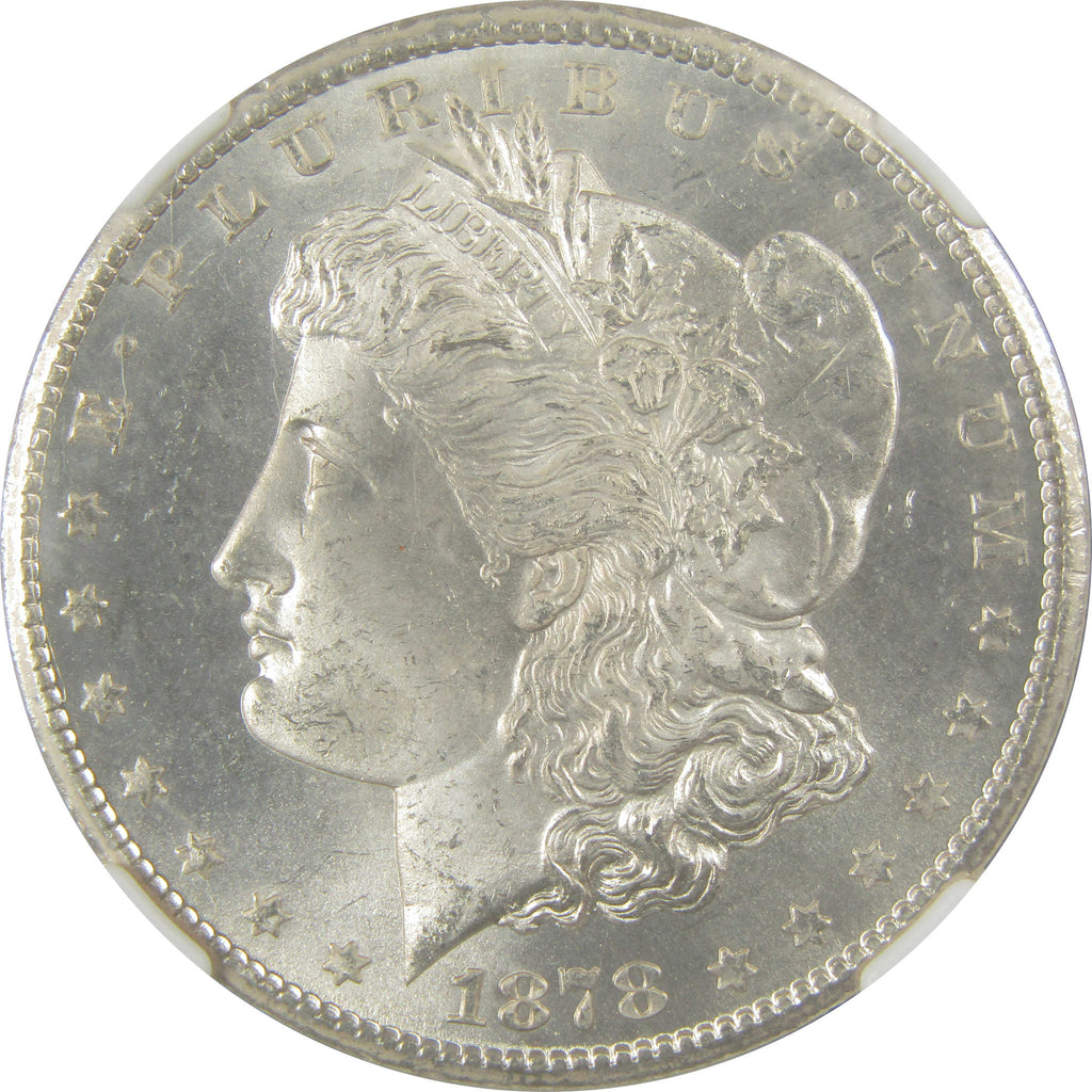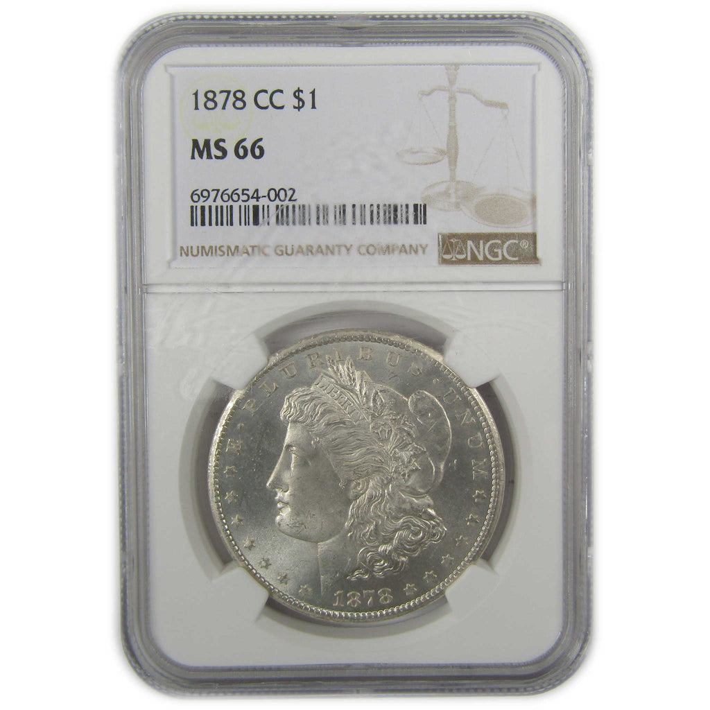 A genuine 1878 CC Morgan Silver Dollar Coin, graded and certified MS 66 by NGC. Contains 90% Silver