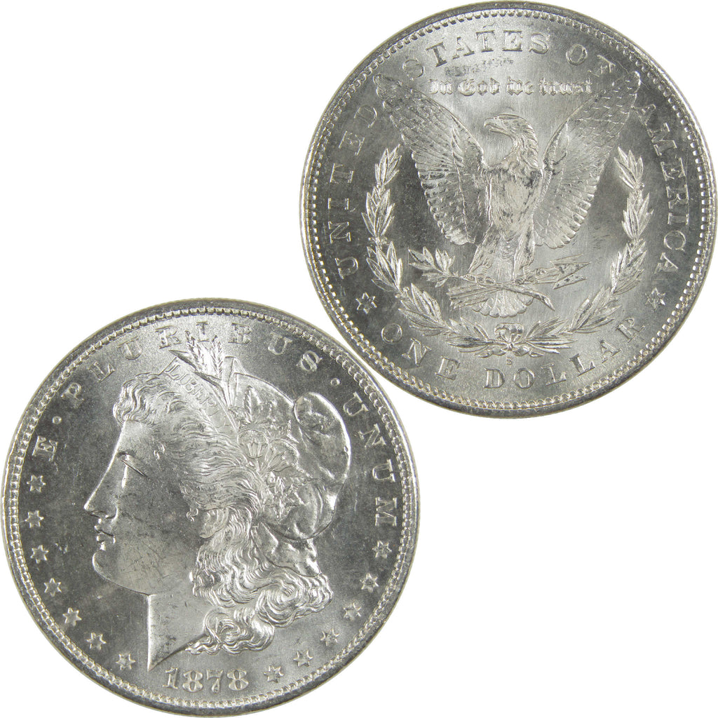 A genuine 1878 S Morgan Silver Dollar Coin, in BU Gem Uncirculated Mint State Condition. Contains 90% Silver