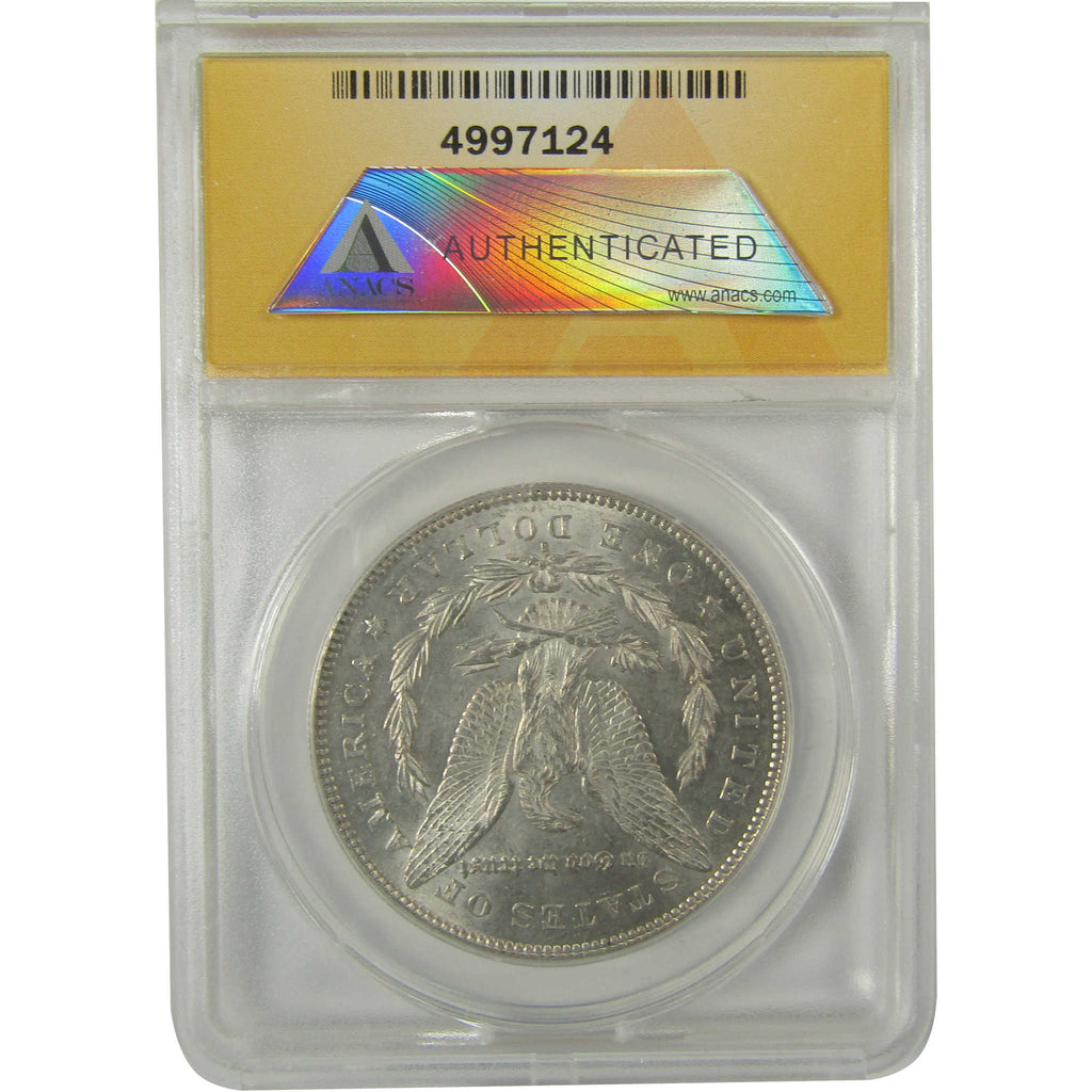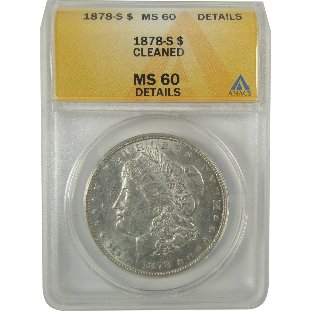 A genuine 1878 S Morgan Silver Dollar Coin, graded and certified MS 60 Details by ANACS. Contains 90% Silver. Cleaned
