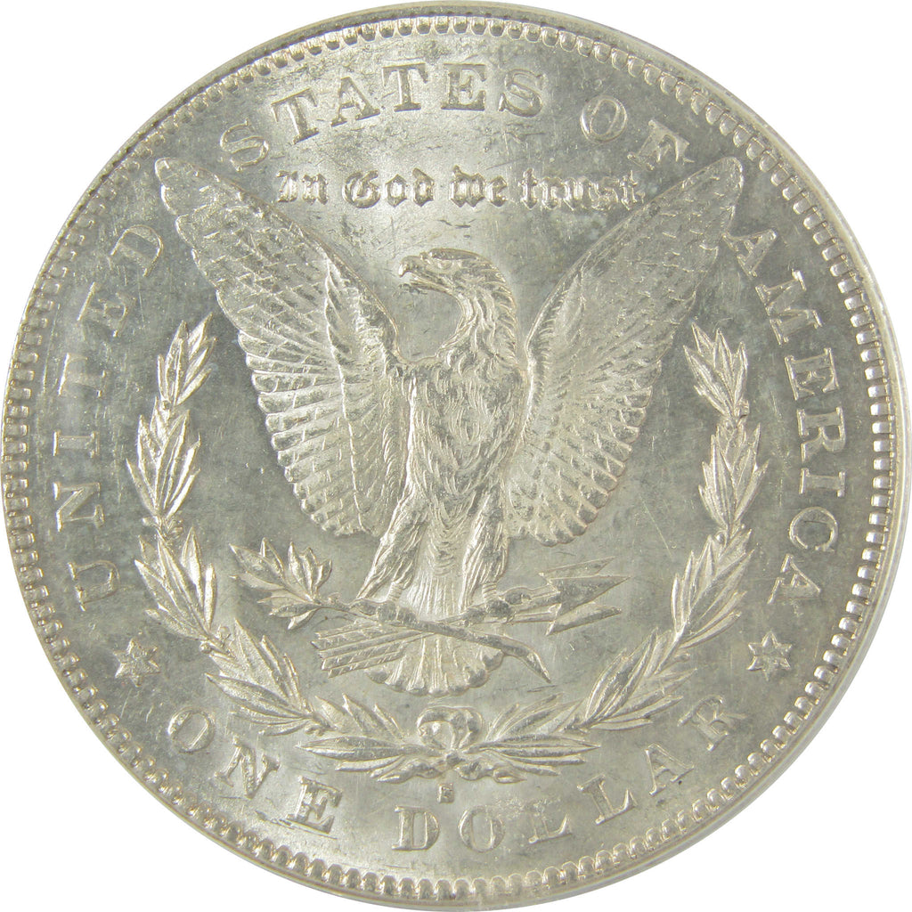 This large 90% silver Morgan dollar bears George T. Morgan's classic depiction of Liberty facing left in a Phrygian cap and a spray of leaves held by a ribbon inscribed LIBERTY. The reverse features an eagle clutching a branch and three arrows.