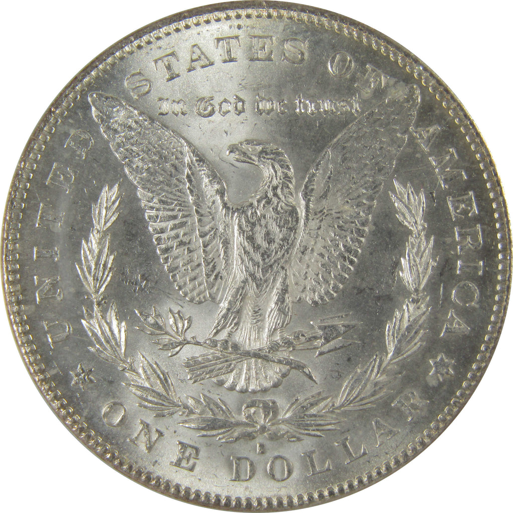 This large 90% silver Morgan dollar bears George T. Morgan's classic depiction of Liberty facing left in a Phrygian cap and a spray of leaves held by a ribbon inscribed LIBERTY. The reverse features an eagle clutching a branch and three arrows.