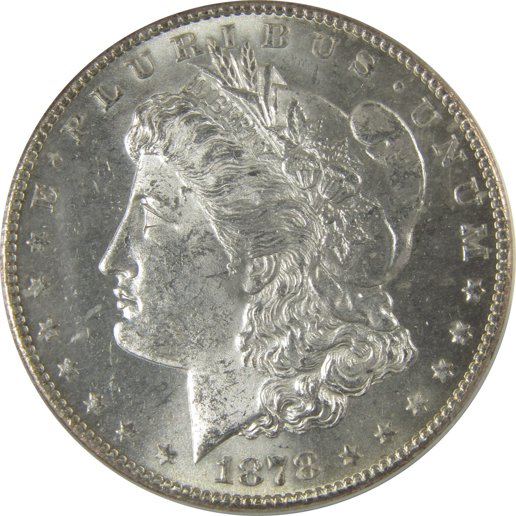 A genuine 1878 S Morgan Silver Dollar Coin, graded and certified MS 63 by ANACS. Contains 90% Silver
