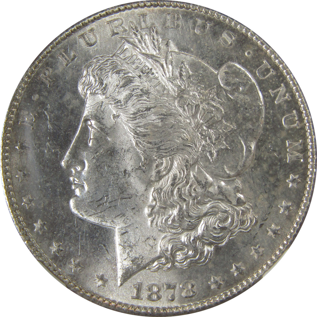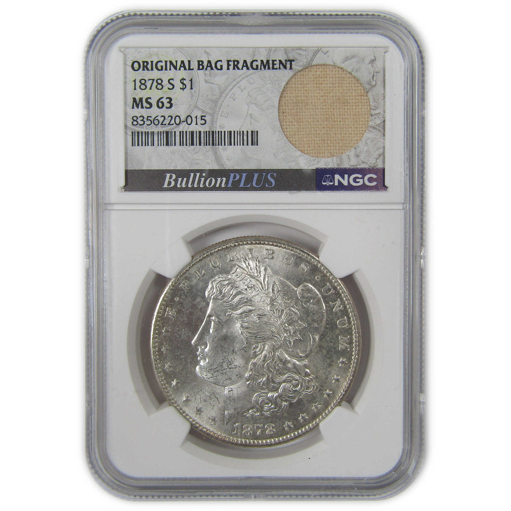 A genuine 1878 S Morgan Silver Dollar Coin, graded and certified MS 63 by NGC. Contains 90% Silver. Comes with a fragment of an original vintage canvas bag embedded in the label