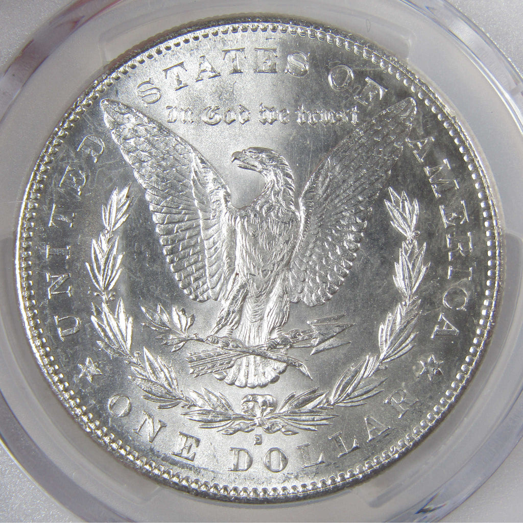A genuine 1878 S Morgan Silver Dollar Coin, graded and certified MS 64 by PCGS. Contains 90% Silver