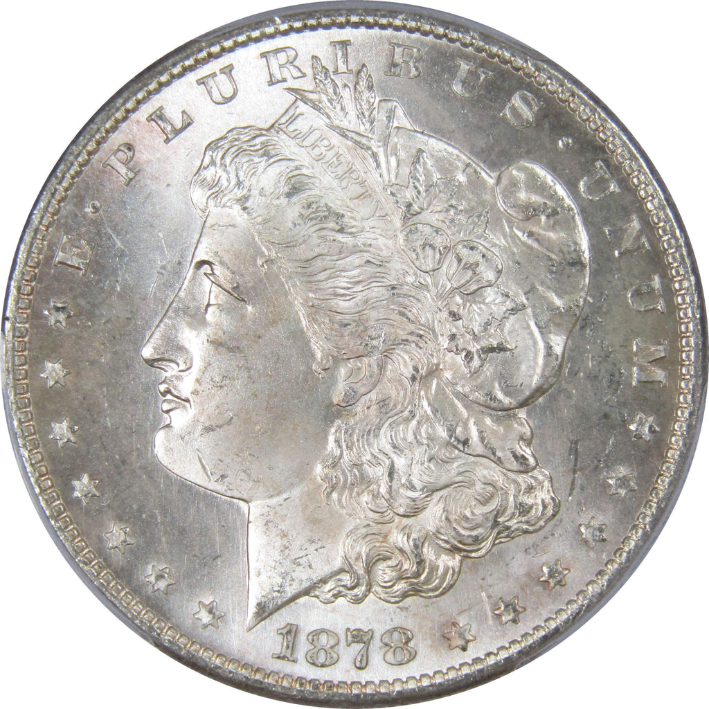 A genuine 1878 S Morgan Silver Dollar Coin, graded and certified MS 65 by PCGS. Contains 90% Silver