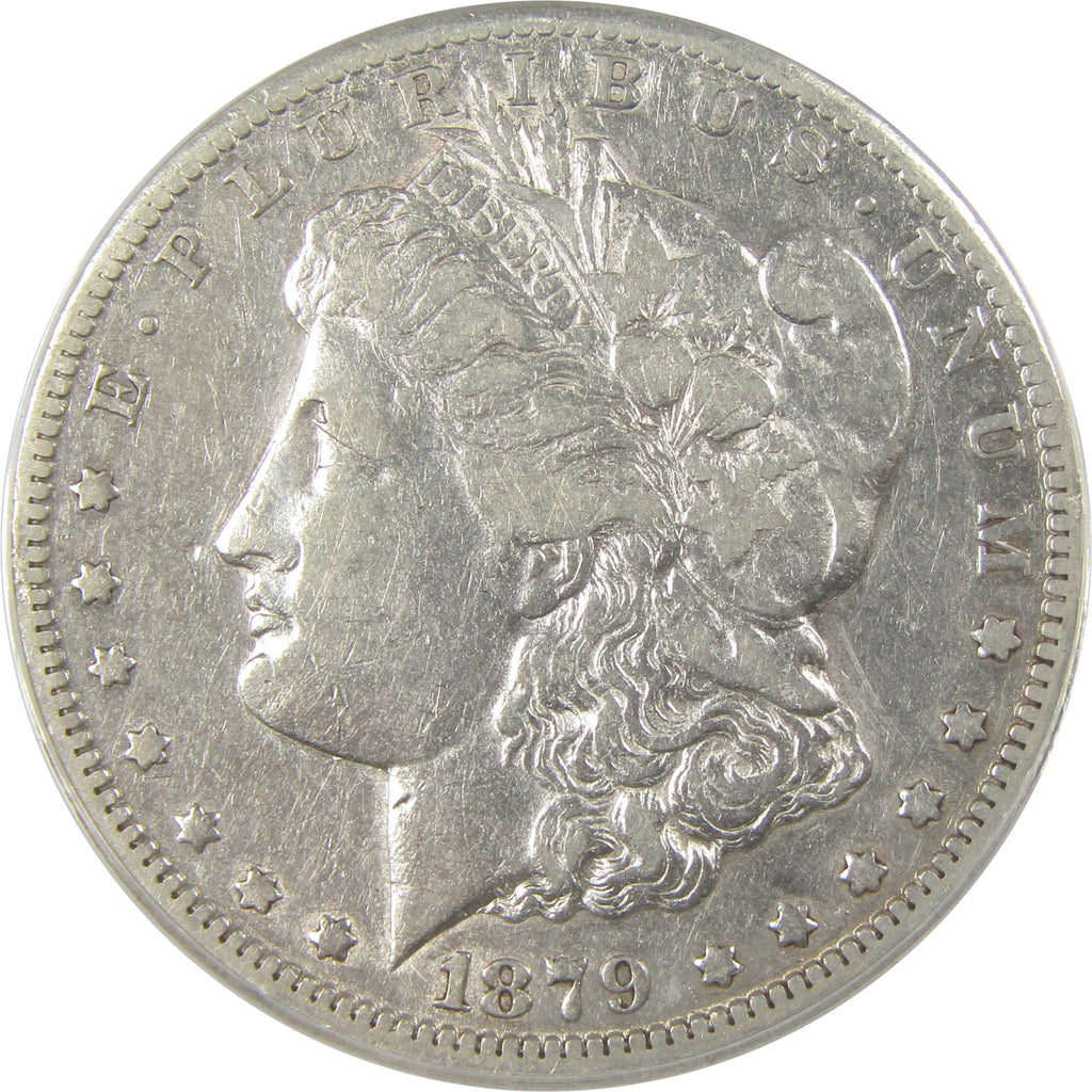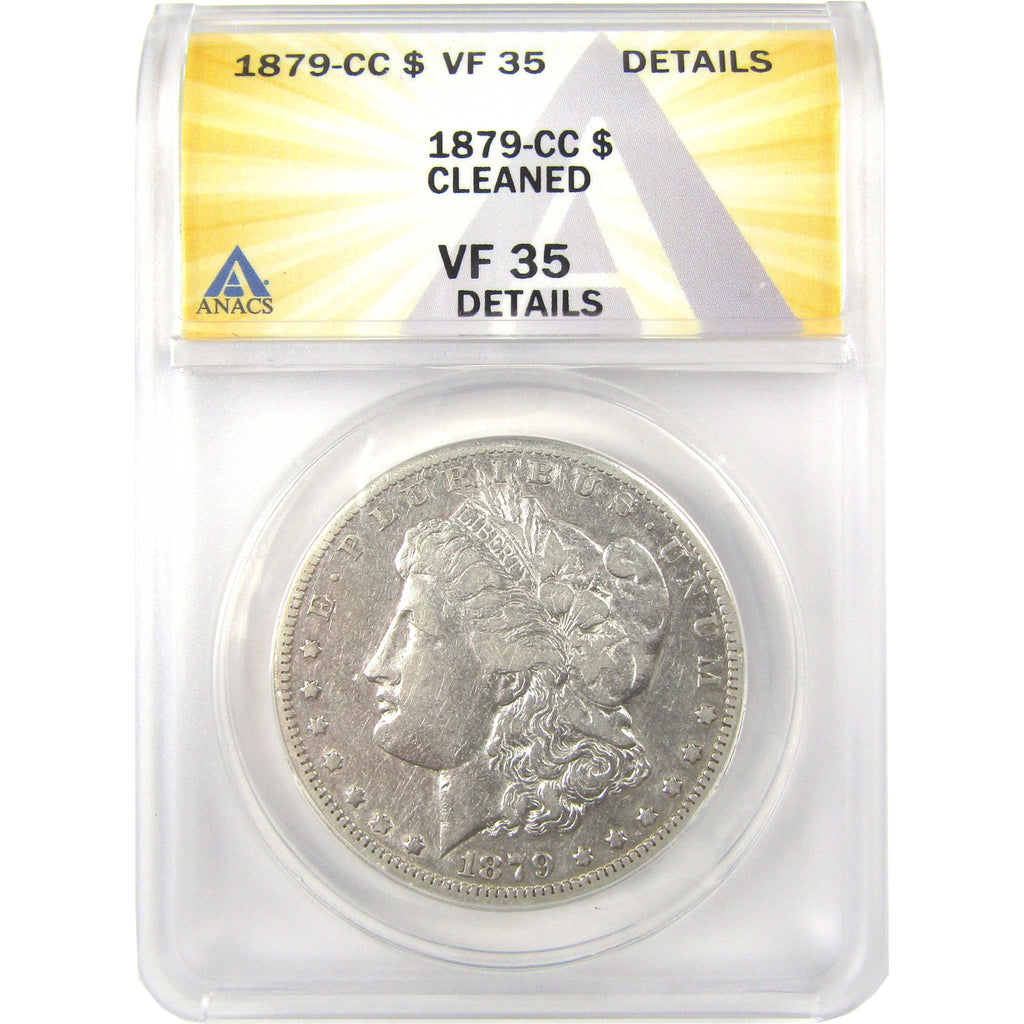 A genuine 1879 CC Morgan Silver Dollar Coin, graded and certified VF 35 Details by ANACS. Contains 90% Silver. Cleaned