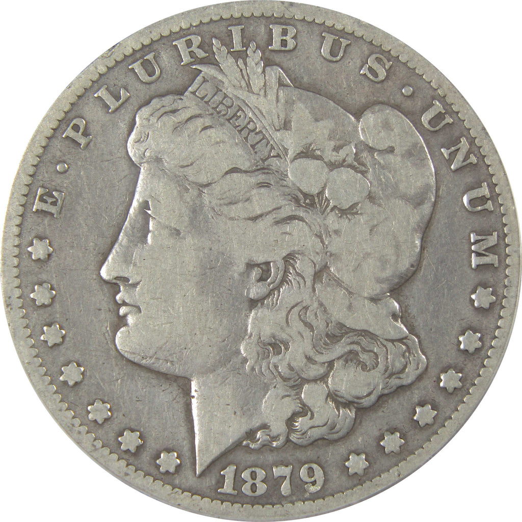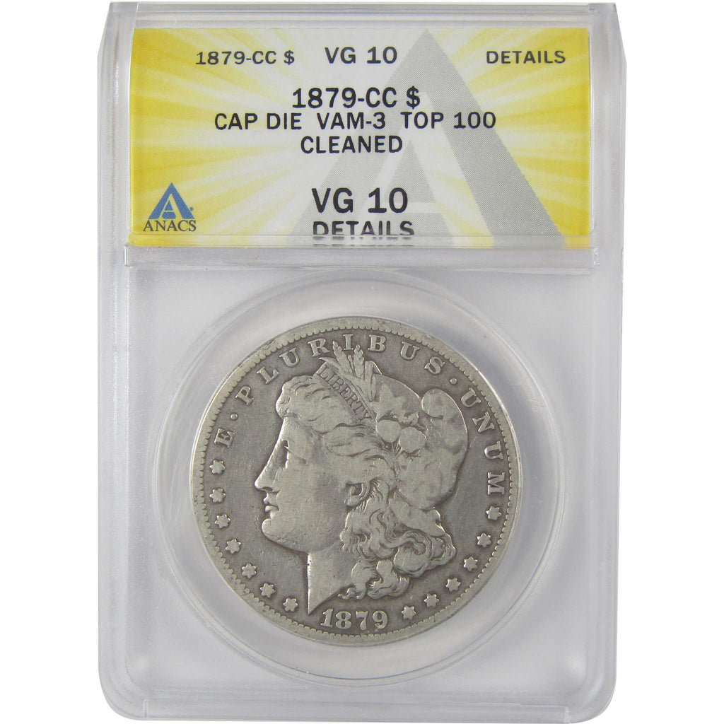 A genuine 1879 CC VAM-3, Capped Die, Top 100 Morgan Silver Dollar Coin, graded and certified VG 10 Details by ANACS. Contains 90% Silver. Cleaned