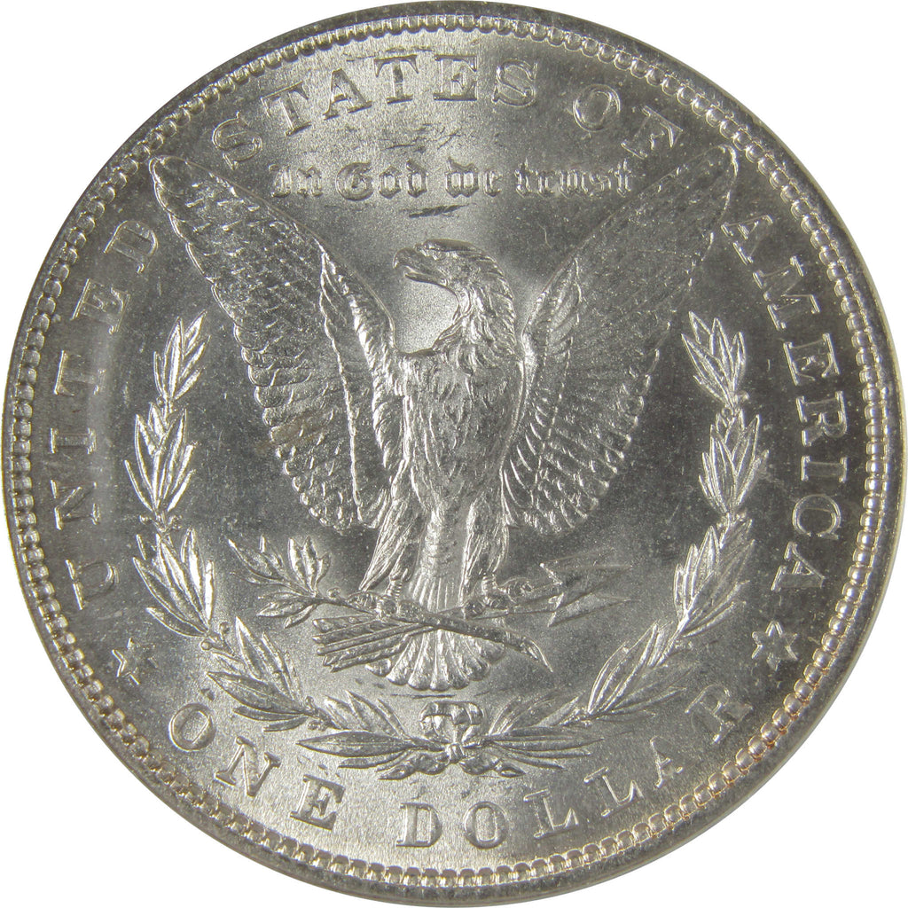 This large 90% silver Morgan dollar bears George T. Morgan's classic depiction of Liberty facing left in a Phrygian cap and a spray of leaves held by a ribbon inscribed LIBERTY. The reverse features an eagle clutching a branch and three arrows.