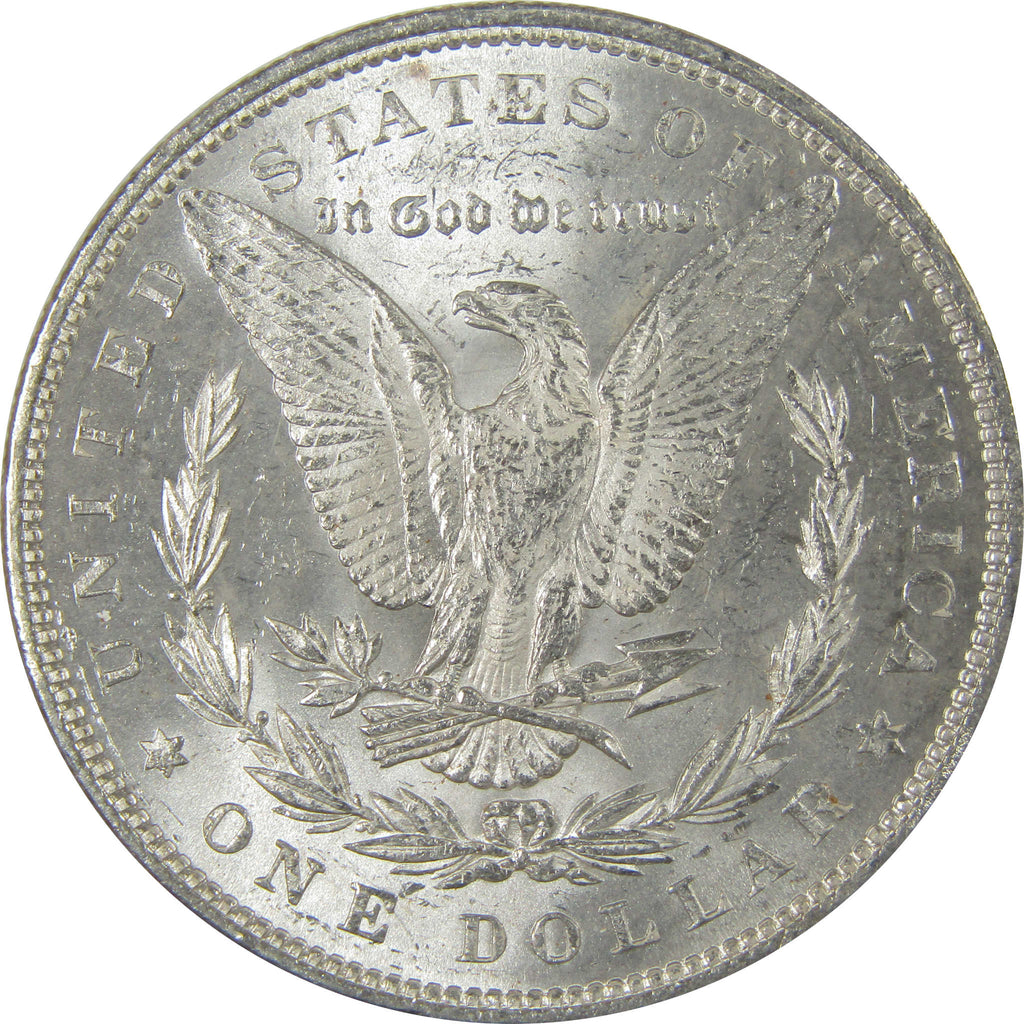 This large 90% silver Morgan dollar bears George T. Morgan's classic depiction of Liberty facing left in a Phrygian cap and a spray of leaves held by a ribbon inscribed LIBERTY. The reverse features an eagle clutching a branch and three arrows.