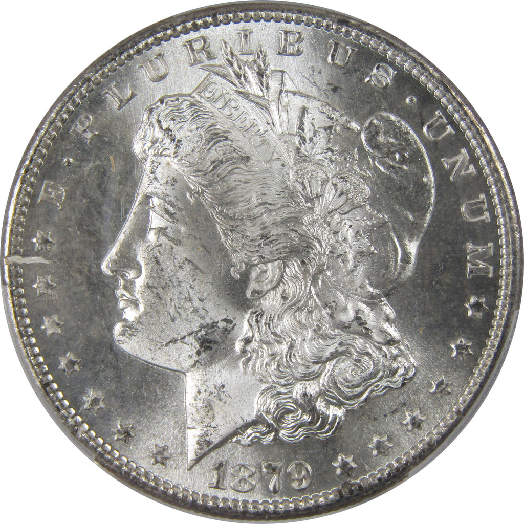 A genuine 1879 S Morgan Silver Dollar Coin, graded and certified MS 63 by PCGS. Contains 90% Silver