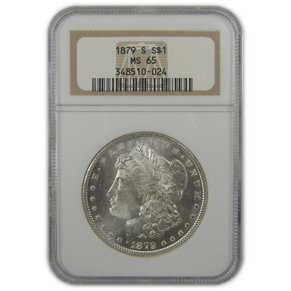 A genuine 1879 S Morgan Silver Dollar Coin, graded and certified MS 65 by NGC. Contains 90% Silver. Toned Reverse