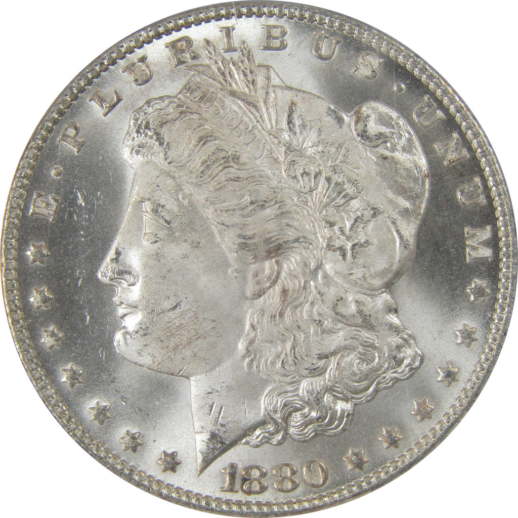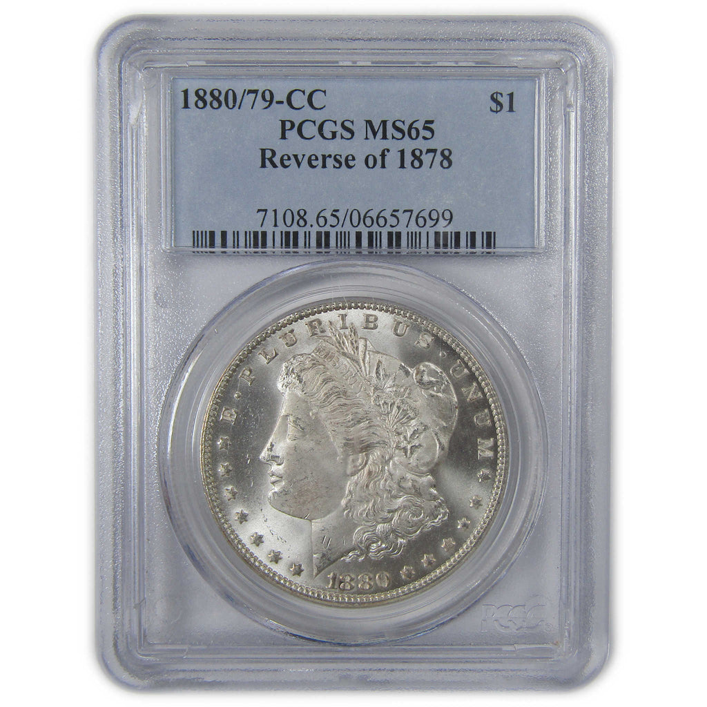 A genuine 1880/79 CC Rev 78 Morgan Silver Dollar Coin, graded and certified MS 65 by PCGS. Contains 90% Silver