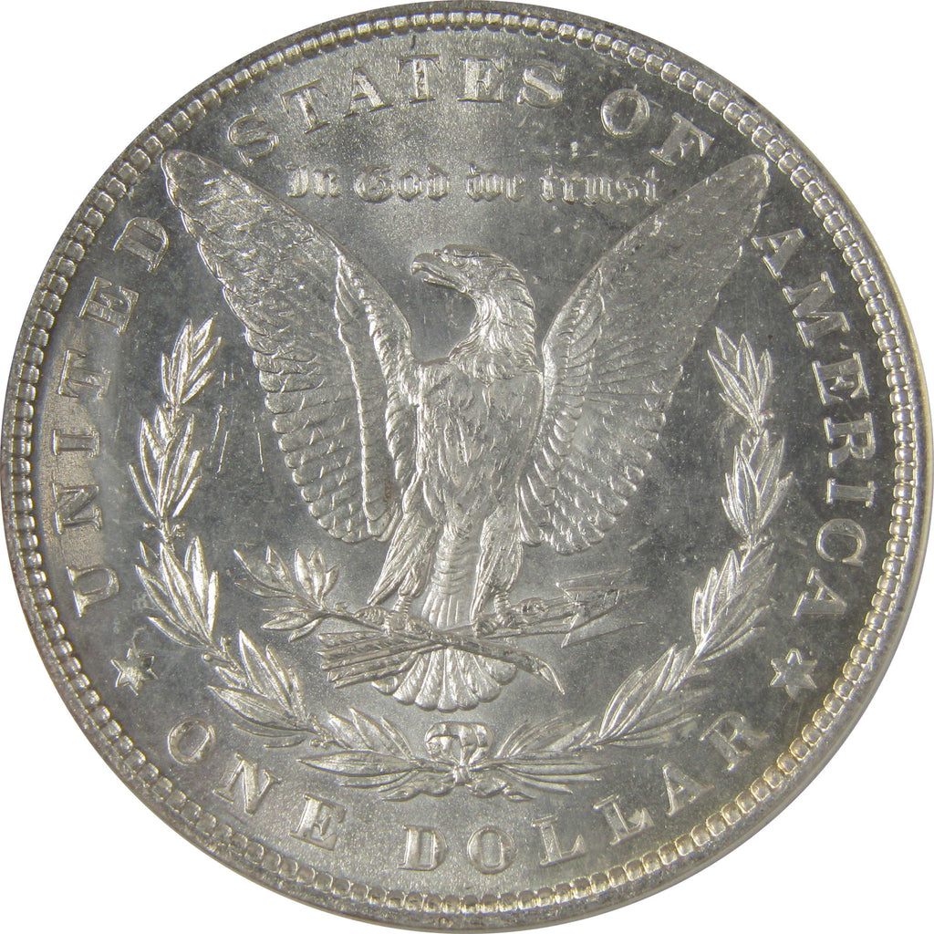 This large 90% silver Morgan dollar bears George T. Morgan's classic depiction of Liberty facing left in a Phrygian cap and a spray of leaves held by a ribbon inscribed LIBERTY. The reverse features an eagle clutching a branch and three arrows.