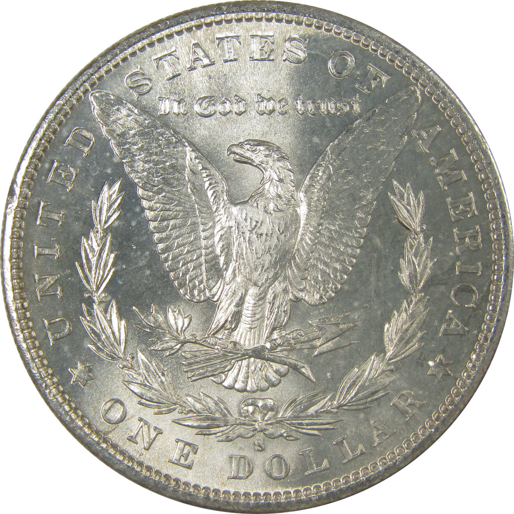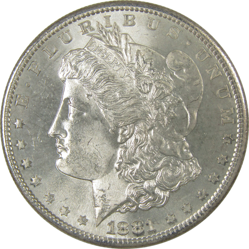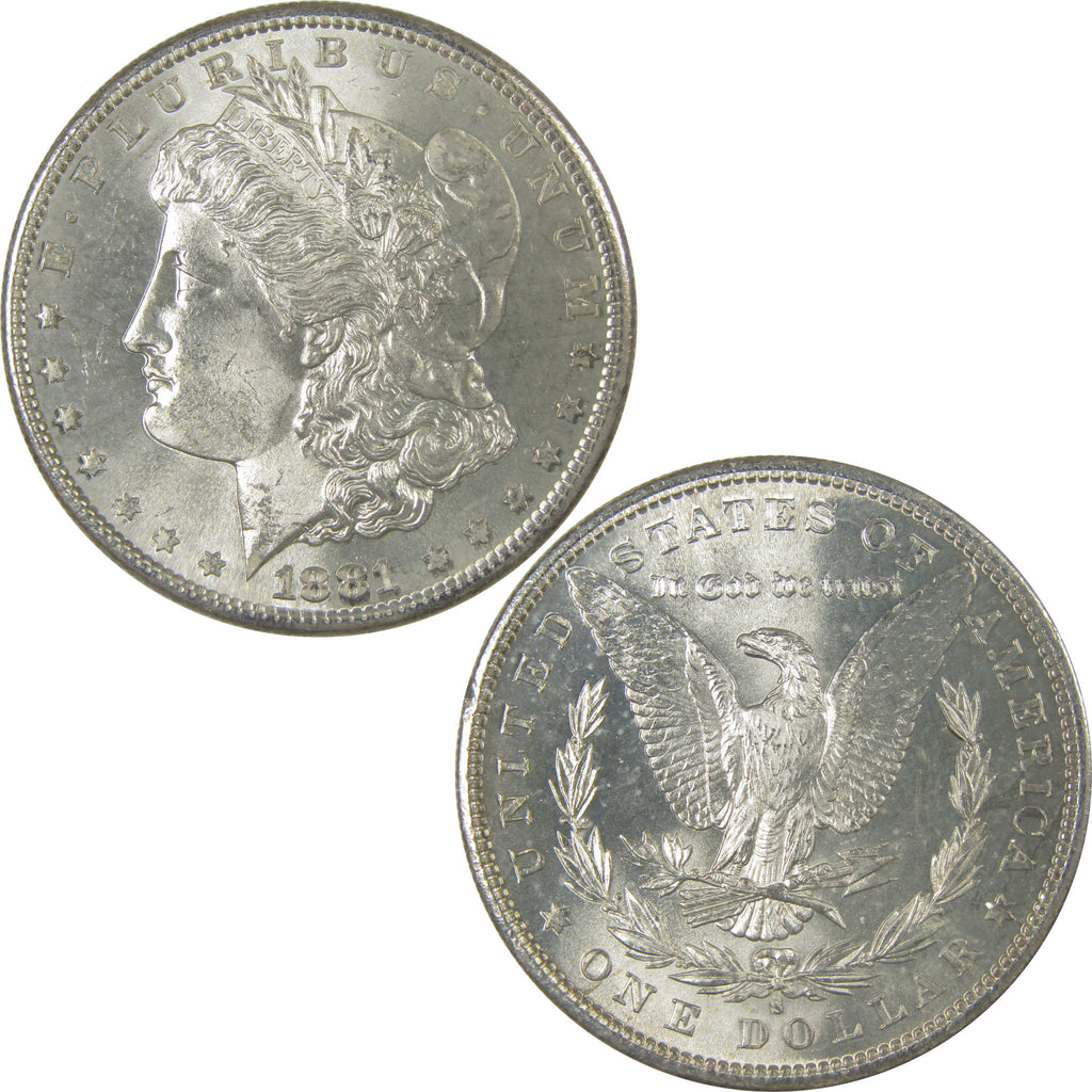 A genuine 1881 S Morgan Silver Dollar Coin, in BU Choice Uncirculated Mint State Condition. Contains 90% Silver