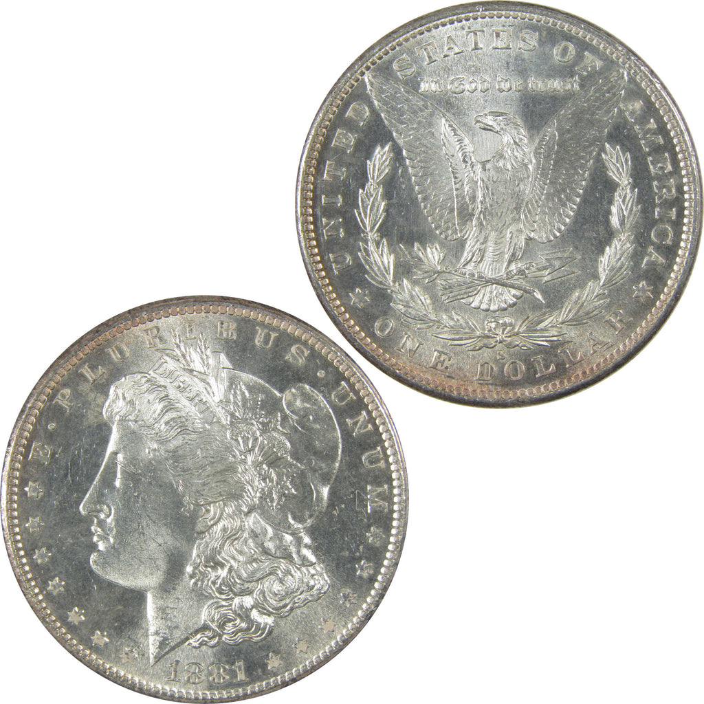 A genuine 1881 S Morgan Silver Dollar Coin, in BU Choice Uncirculated Mint State Condition. Contains 90% Silver