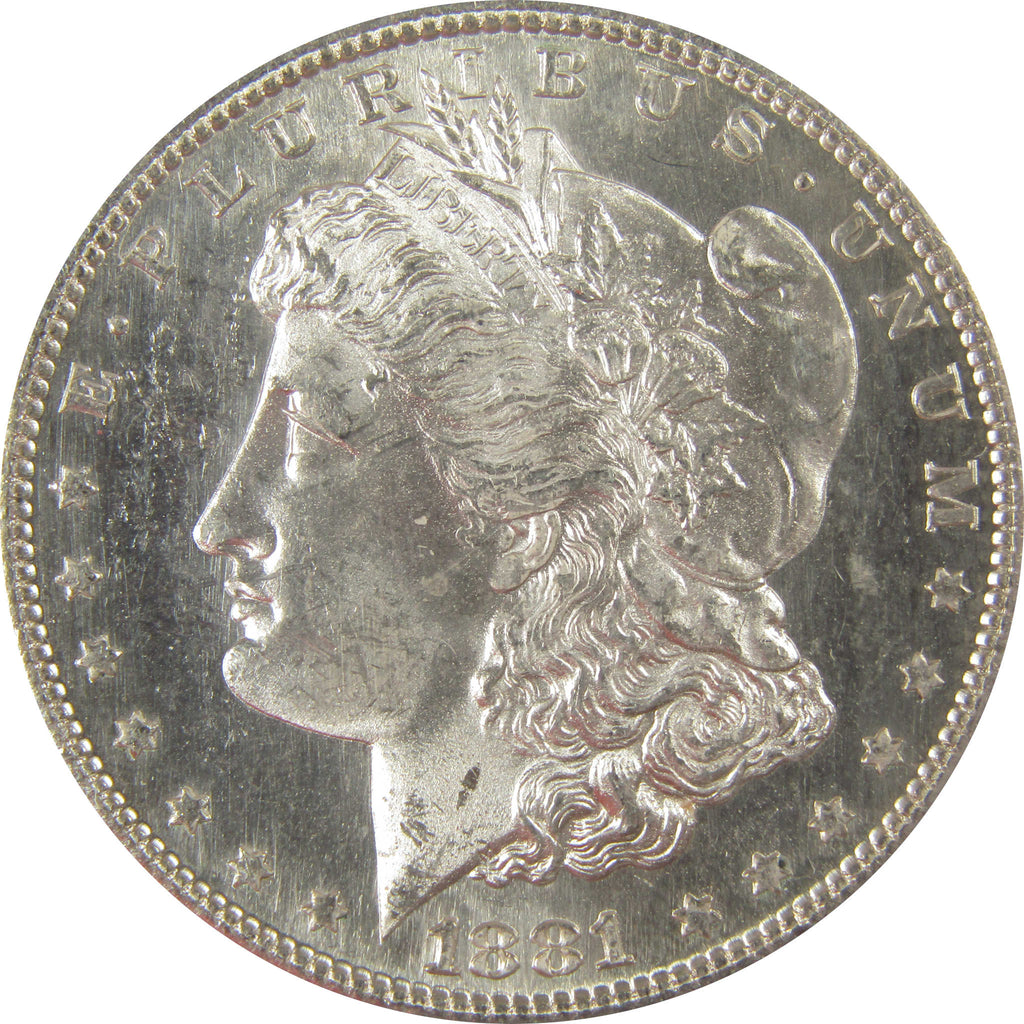 A genuine 1881 S Morgan Silver Dollar Coin, graded and certified MS 62 by ANACS. Contains 90% Silver