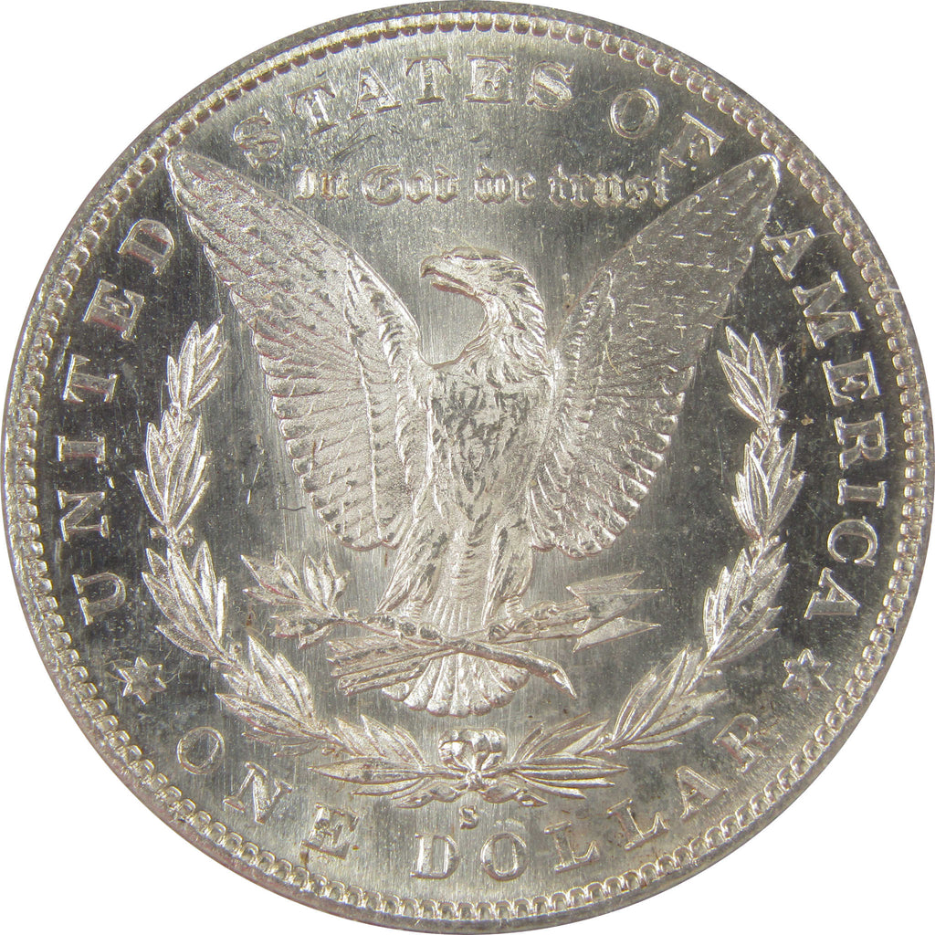 This large 90% silver Morgan dollar bears George T. Morgan's classic depiction of Liberty facing left in a Phrygian cap and a spray of leaves held by a ribbon inscribed LIBERTY. The reverse features an eagle clutching a branch and three arrows.