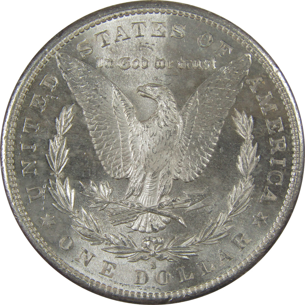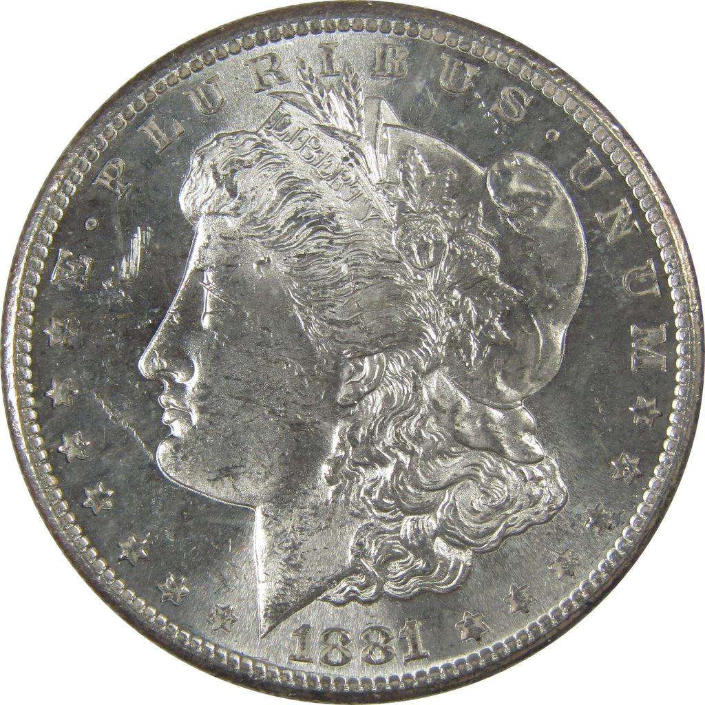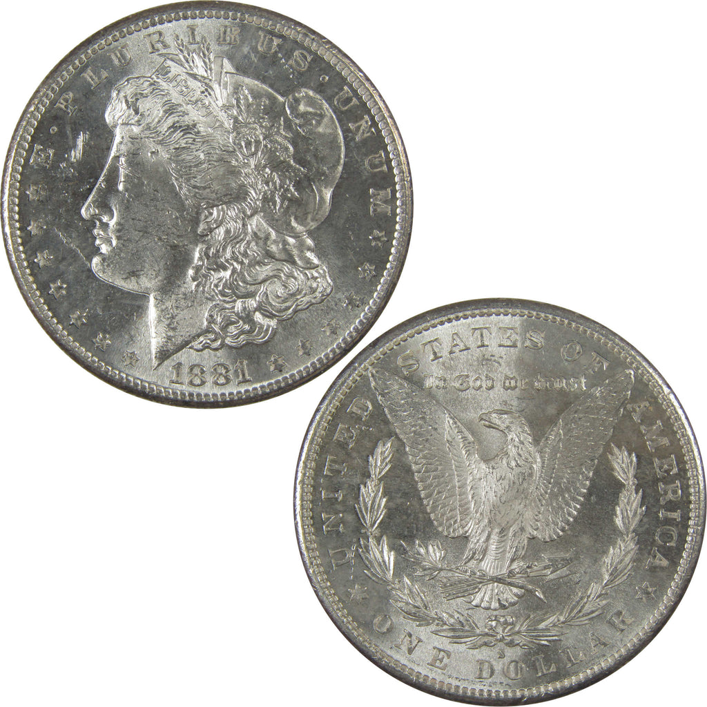 A genuine 1881 S Morgan Silver Dollar Coin, in Uncirculated Mint State Condition. Contains 90% Silver