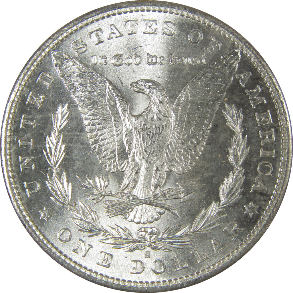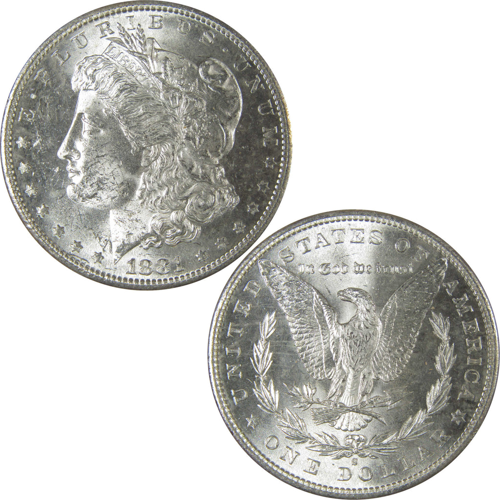 A genuine 1881 S Morgan Silver Dollar Coin, in Uncirculated Mint State Condition. Contains 90% Silver