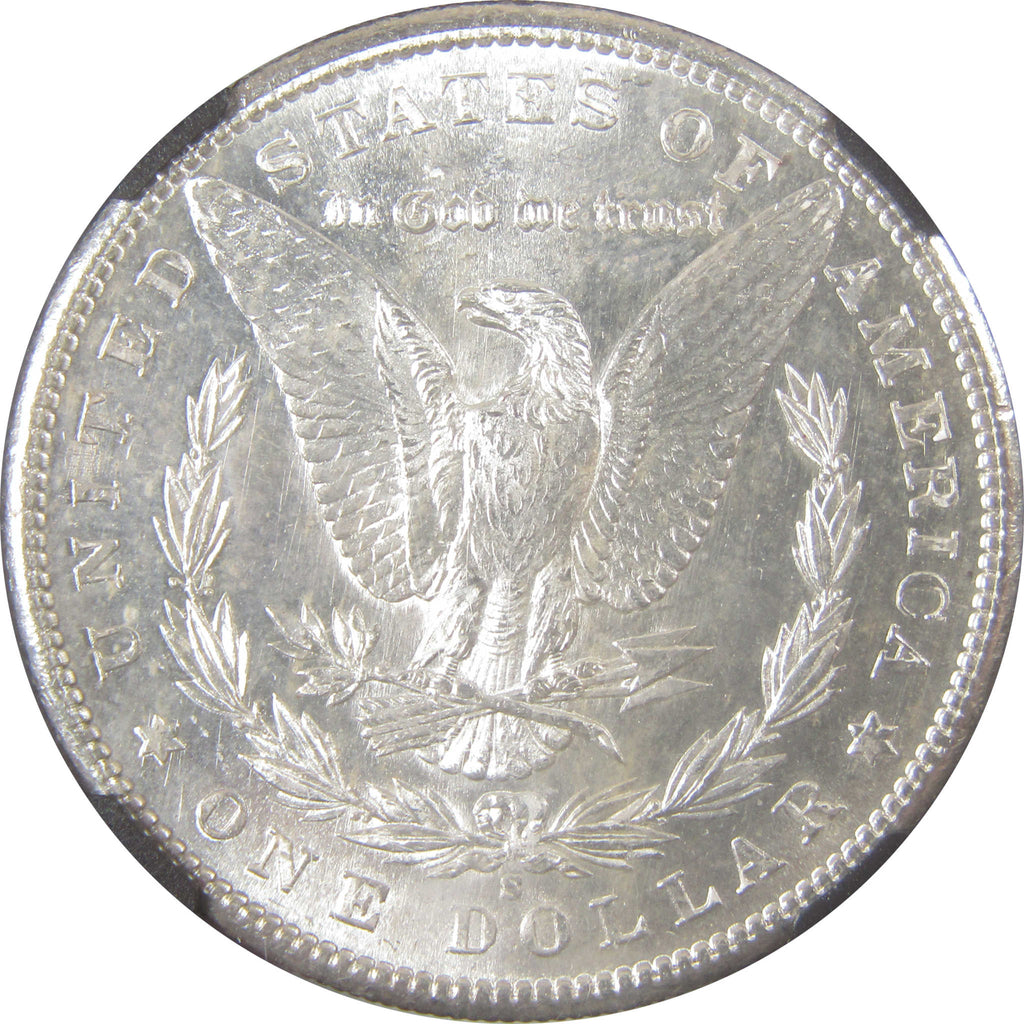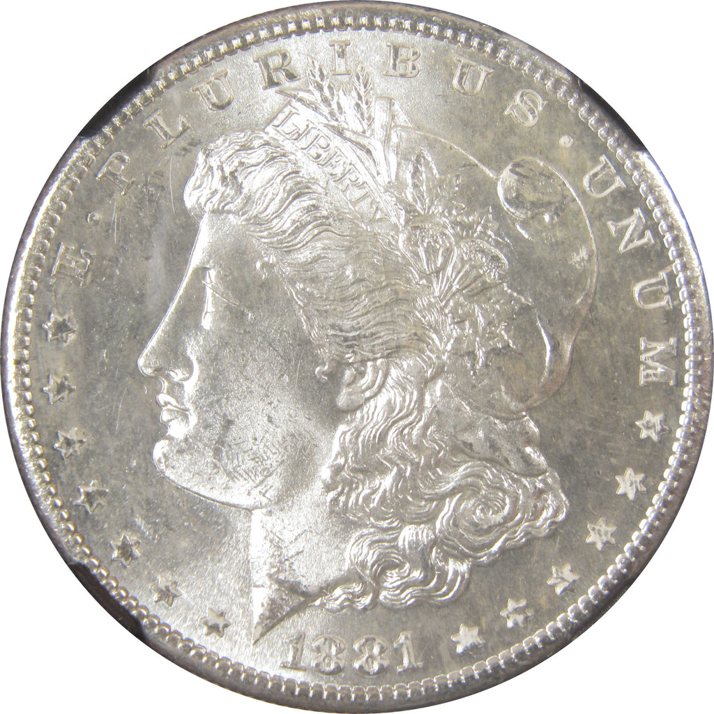 A genuine 1881 S Morgan Silver Dollar Coin, graded and certified MS 64 by NGC. Contains 90% Silver. Comes with a fragment of an original vintage canvas bag embedded in the label
