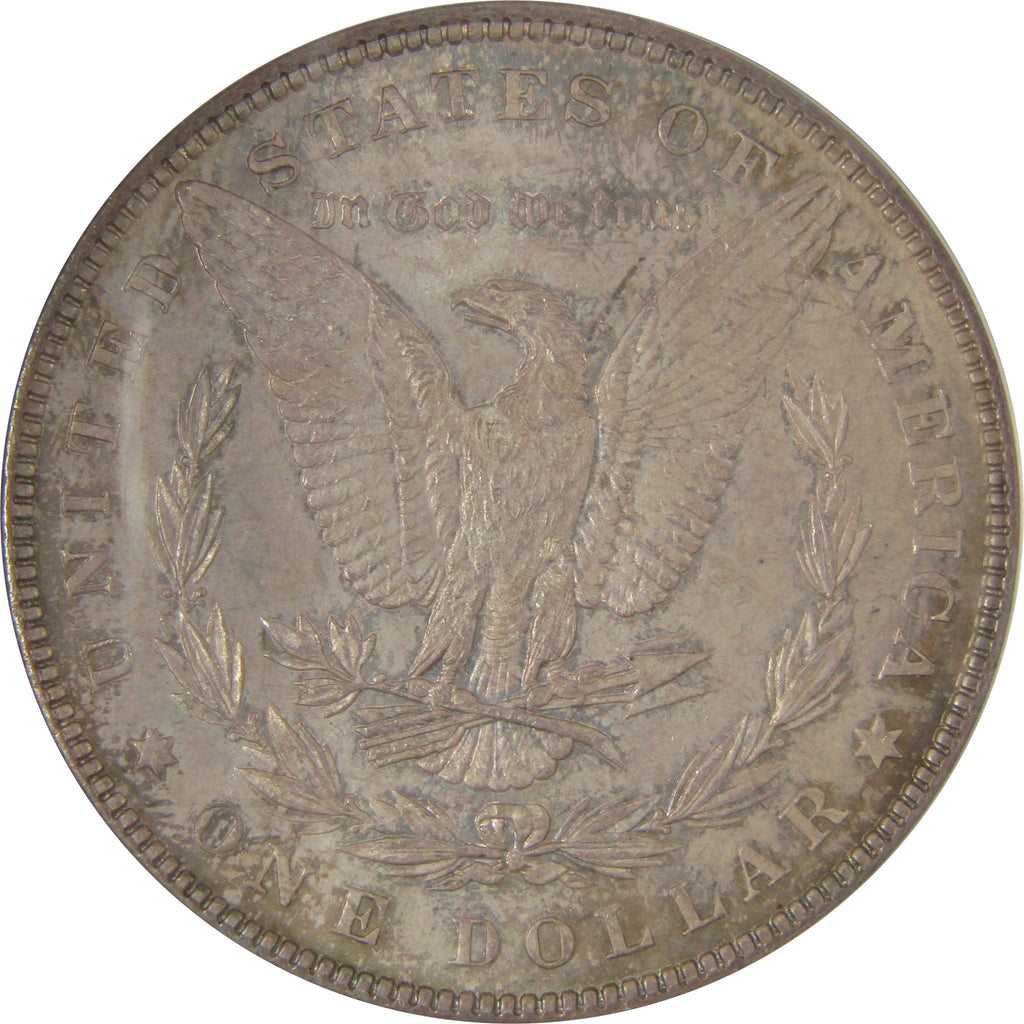 This large 90% silver Morgan dollar bears George T. Morgan's classic depiction of Liberty facing left in a Phrygian cap and a spray of leaves held by a ribbon inscribed LIBERTY. The reverse features an eagle clutching a branch and three arrows.