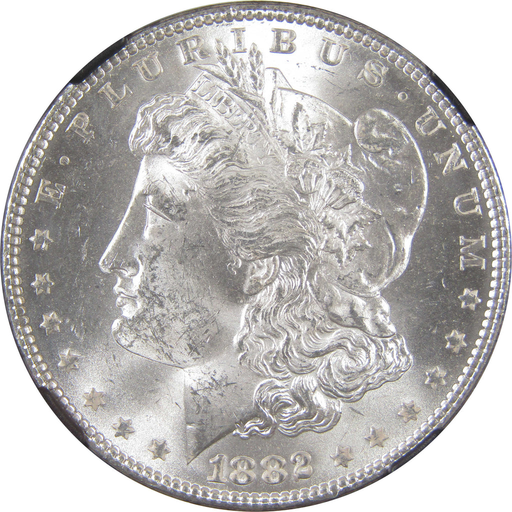 A genuine 1882 Morgan Silver Dollar Coin, graded and certified MS 63 by NGC. Contains 90% Silver. Original Bag Fragment