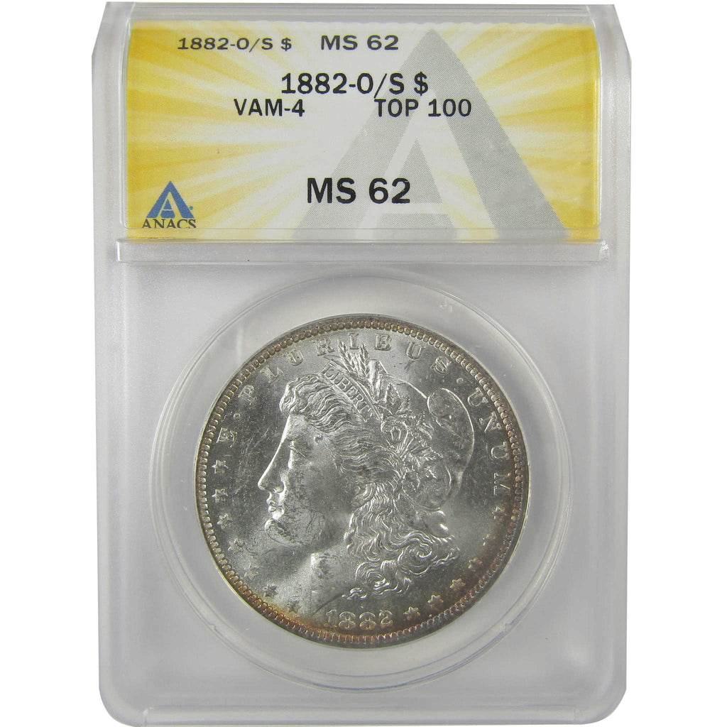 A genuine 1882 O/S VAM-4, Recessed, Top 100 Morgan Silver Dollar Coin, graded and certified MS 62 by ANACS. Contains 90% Silver