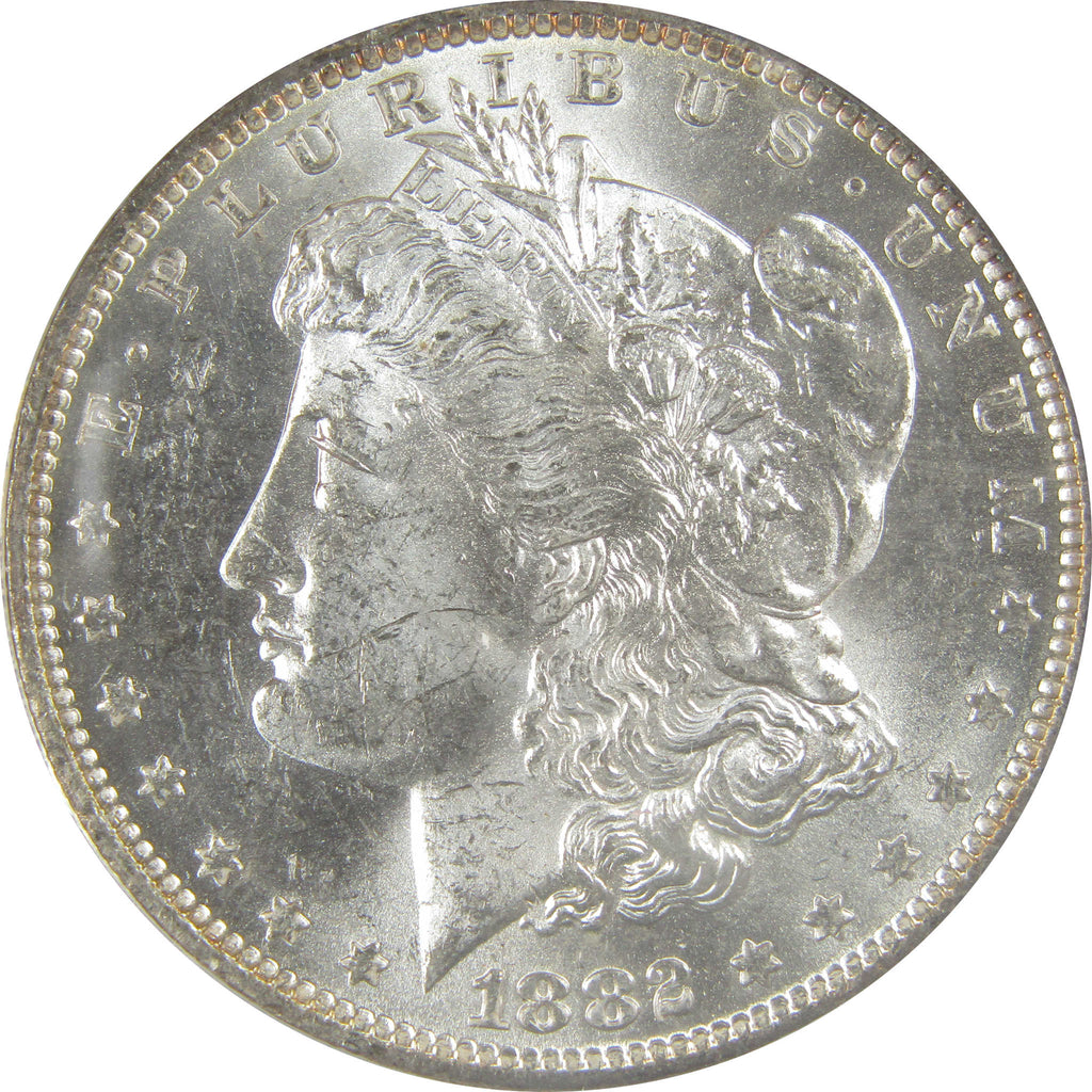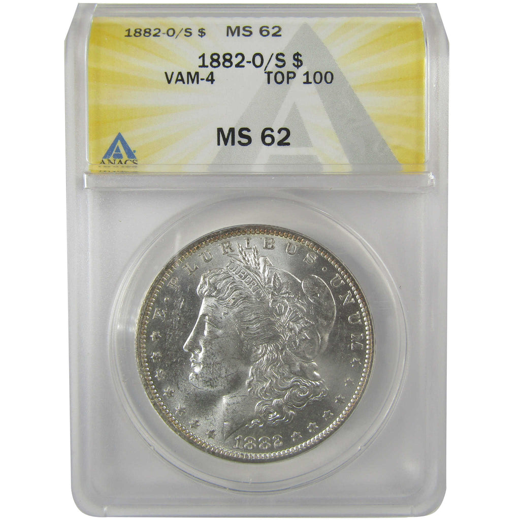 A genuine 1882 O/S VAM-4, Recessed, Top 100 Morgan Silver Dollar Coin, graded and certified MS 62 by ANACS. Contains 90% Silver