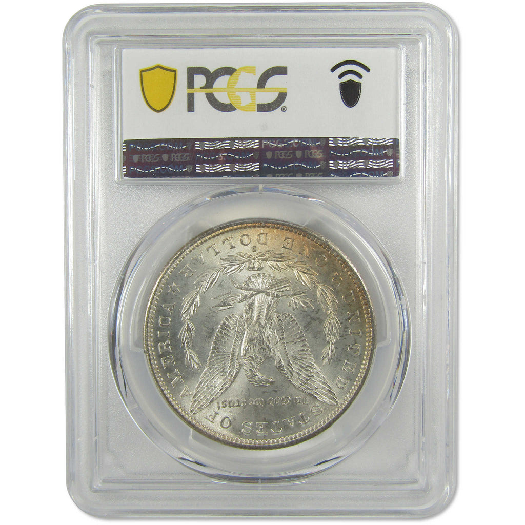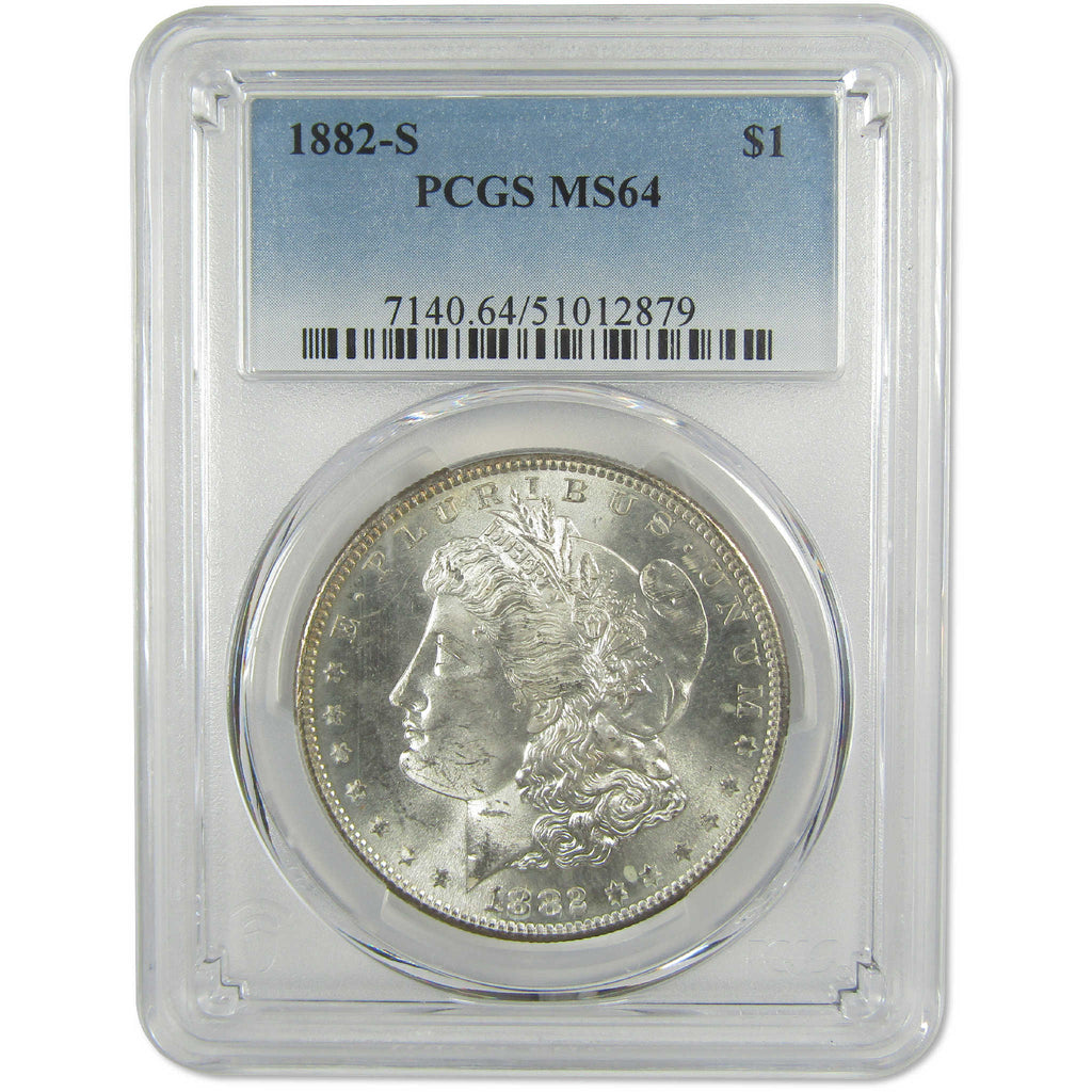 A genuine 1882 S Morgan Silver Dollar Coin, graded and certified MS 64 by PCGS. Contains 90% Silver