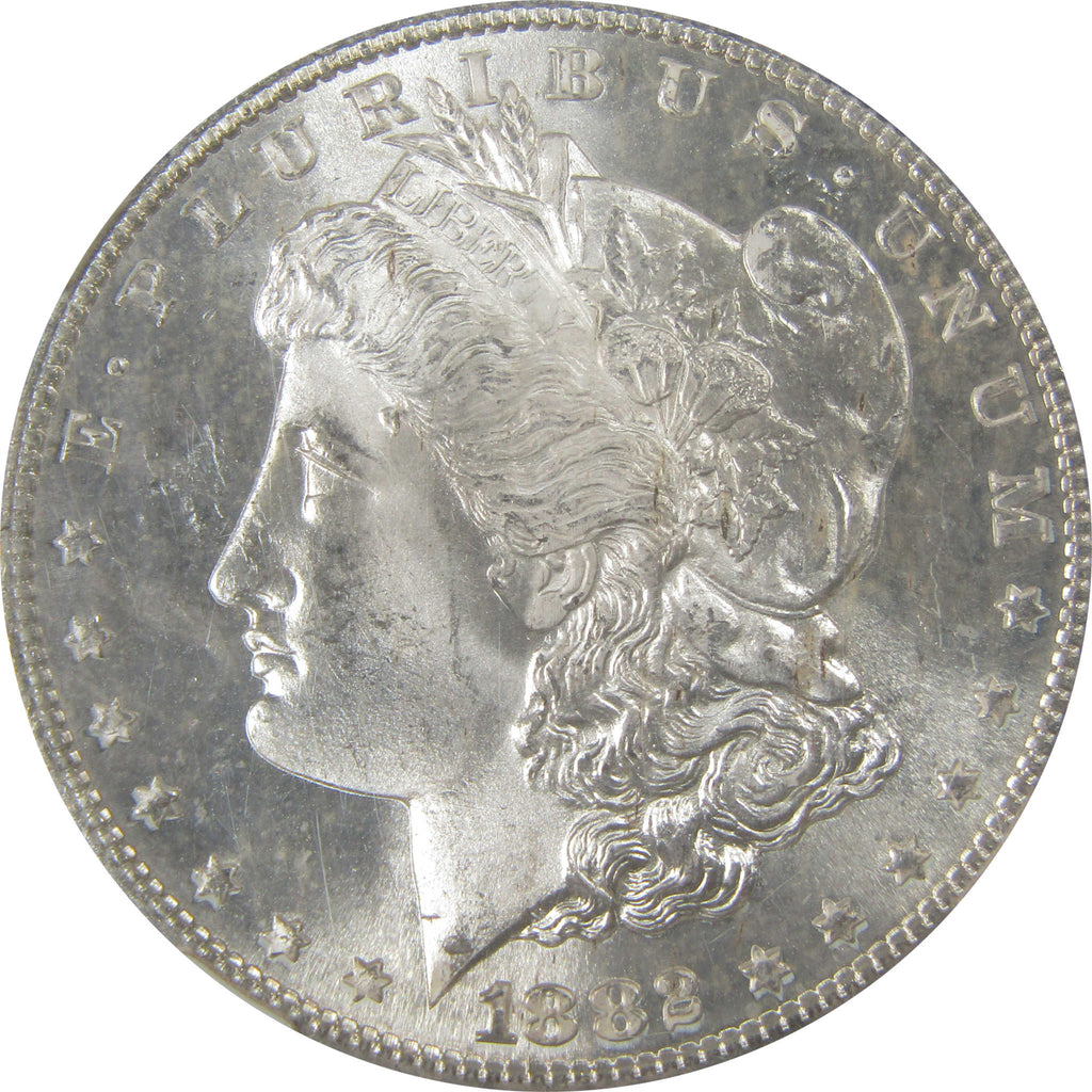 A genuine 1882 S Morgan Silver Dollar Coin, graded and certified MS 65 by NGC. Contains 90% Silver
