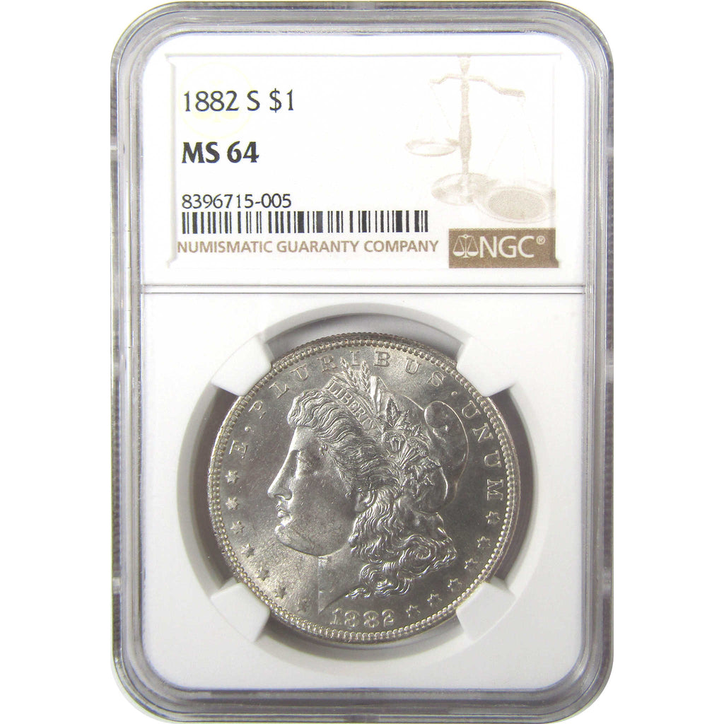A genuine 1882 S Morgan Silver Dollar Coin, graded and certified MS 64 by NGC. Contains 90% Silver