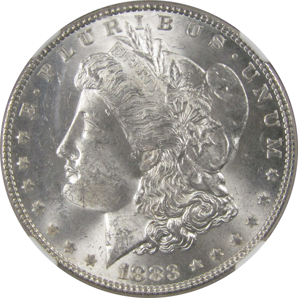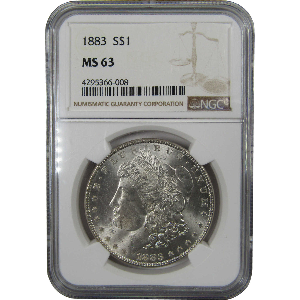 A genuine 1883 Morgan Silver Dollar Coin, graded and certified MS 63 by NGC. Contains 90% Silver