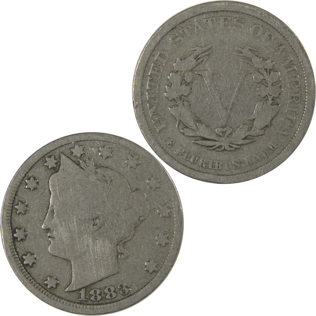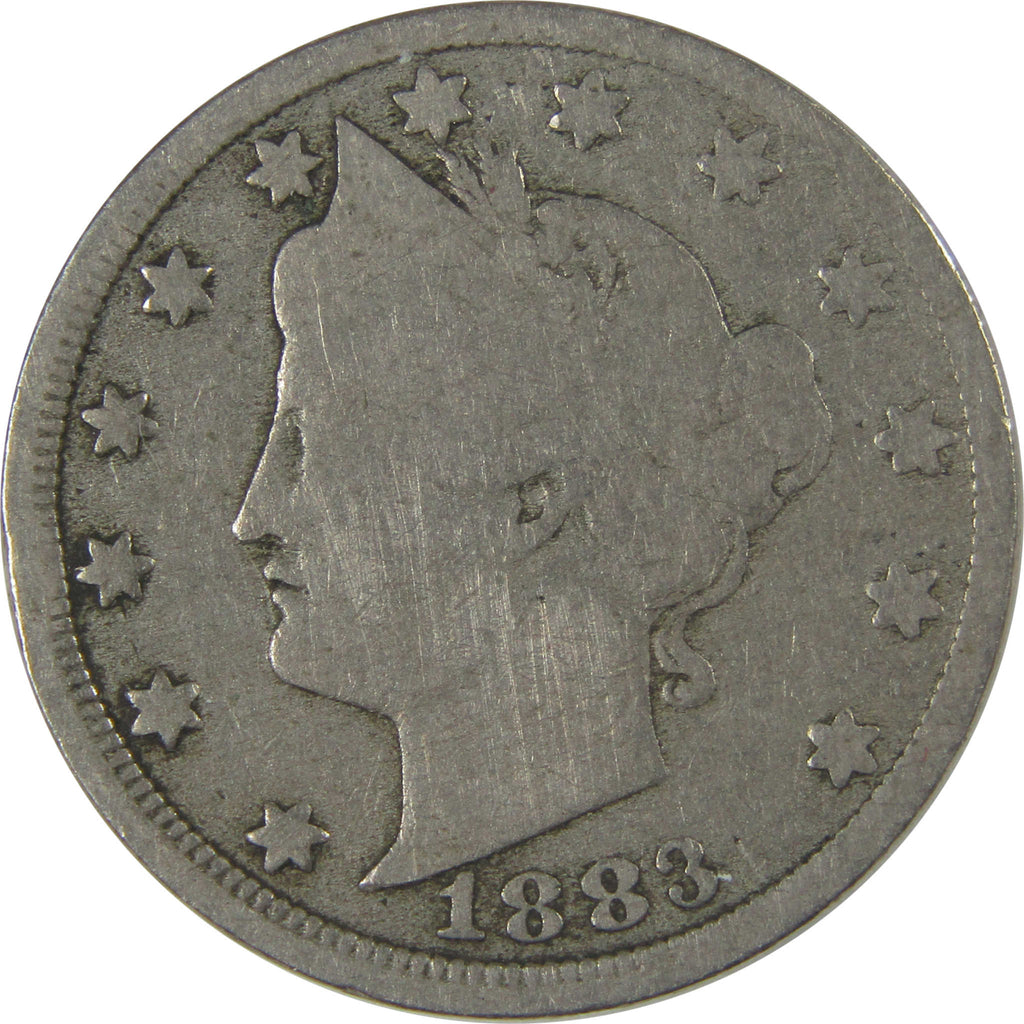 A genuine 1883 No Cents Liberty Head V Nickel Coin, in G Good Details Condition. Damaged