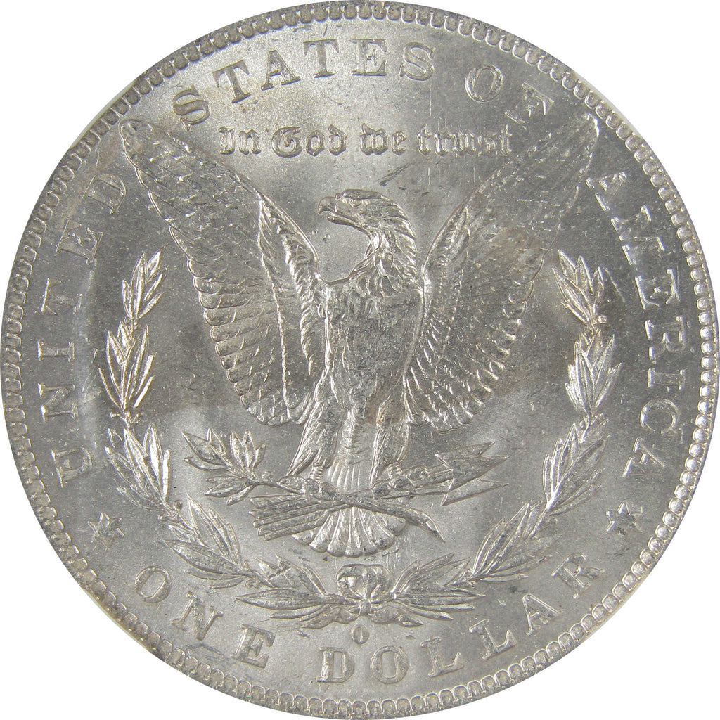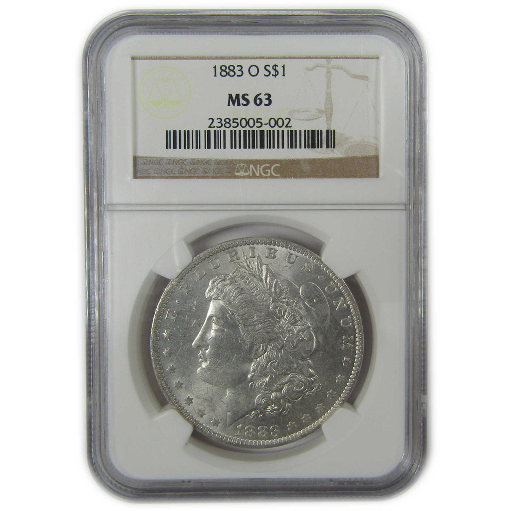 A genuine 1883 O Morgan Silver Dollar Coin, graded and certified MS 63 by NGC. Contains 90% Silver