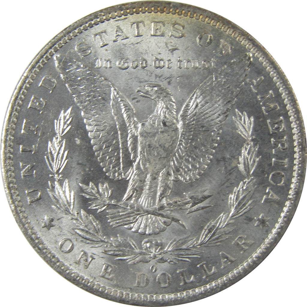 This large 90% silver Morgan dollar bears George T. Morgan's classic depiction of Liberty facing left in a Phrygian cap and a spray of leaves held by a ribbon inscribed LIBERTY. The reverse features an eagle clutching a branch and three arrows.